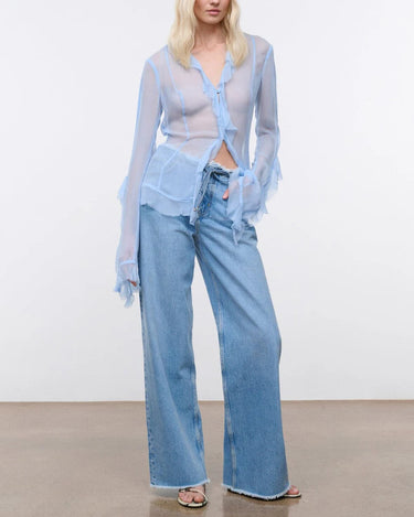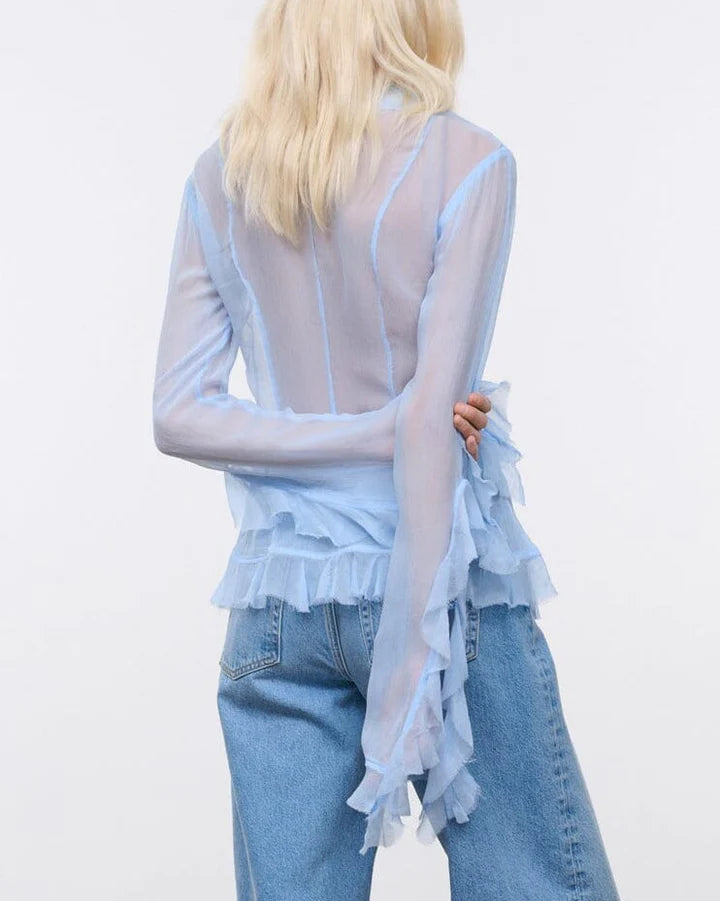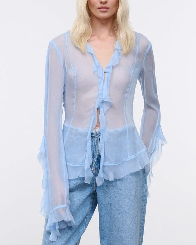 The Kellcy Top is a sheer crinkle chiffon long sleeve top featuring cascading ruffles at the front and sleeves.