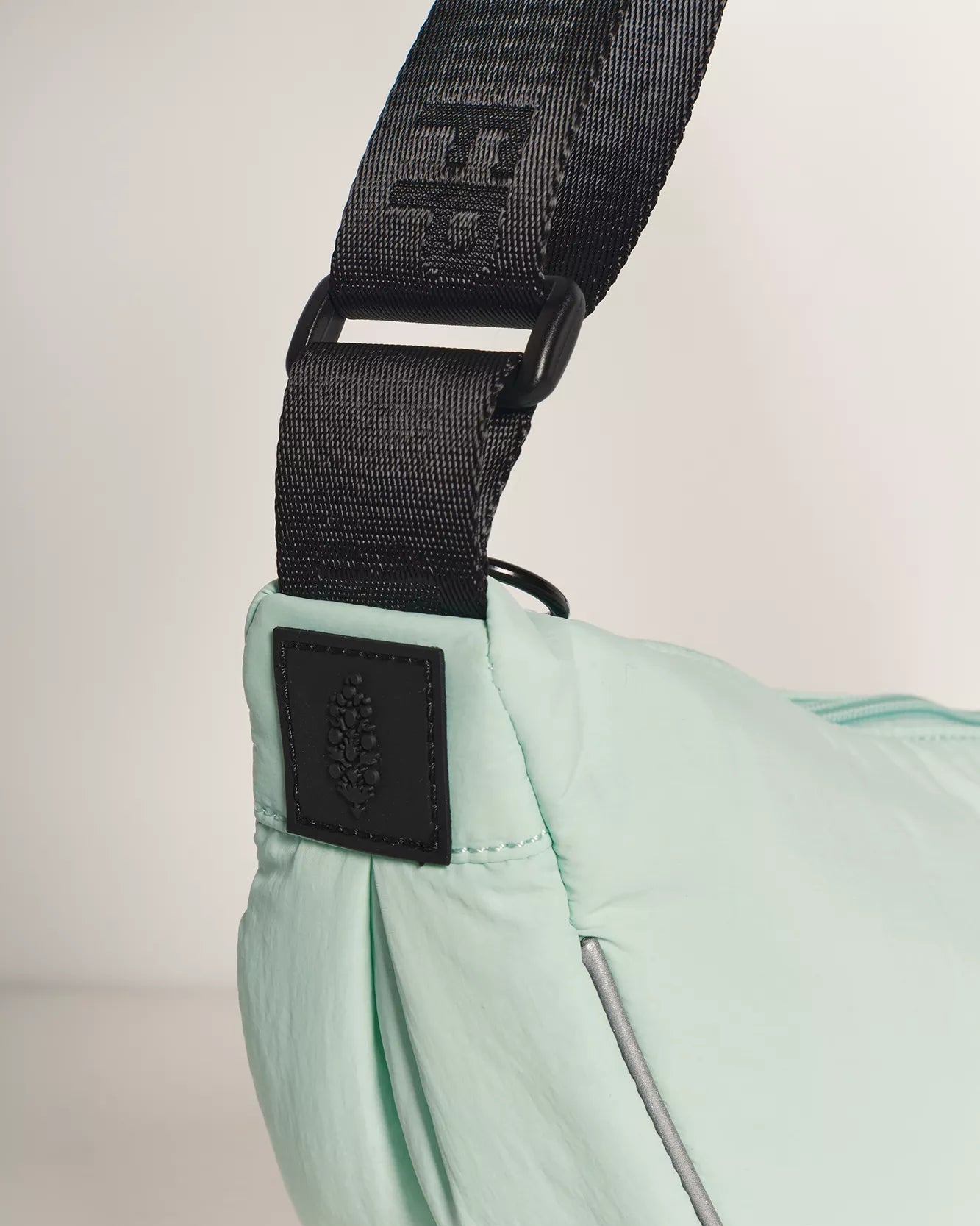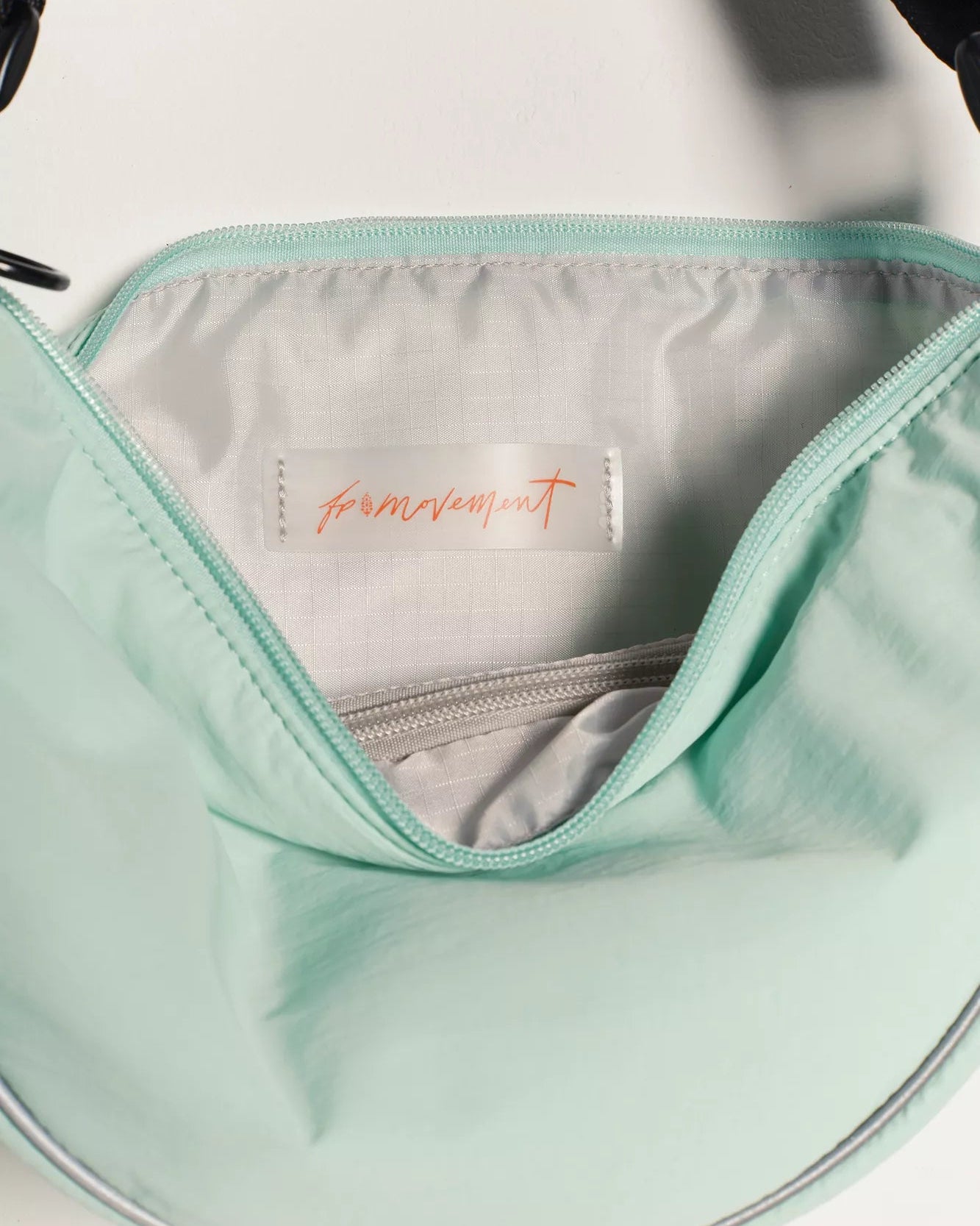 Features: Sling style, adjustable shoulder strap, zip top closure, fully lined interior, reflective trim at sides, FP Mvmt logo at strap, zip-closure interior pocket