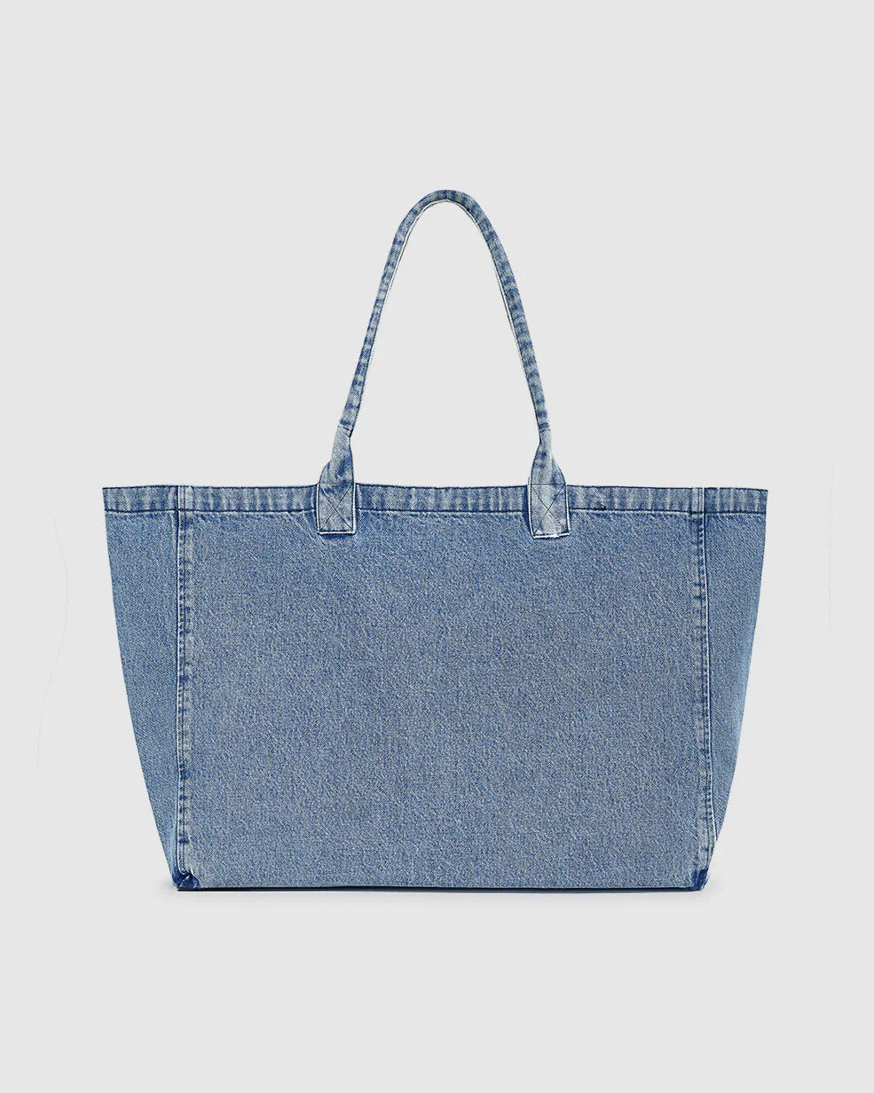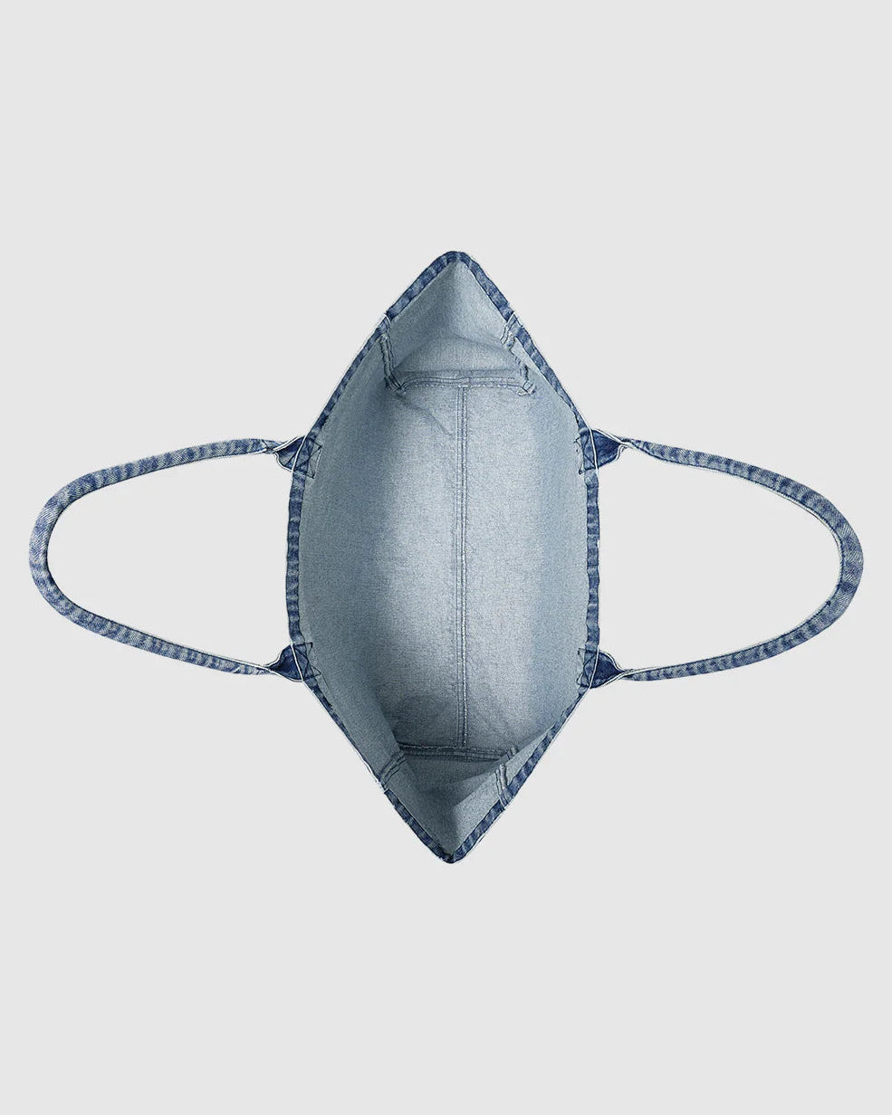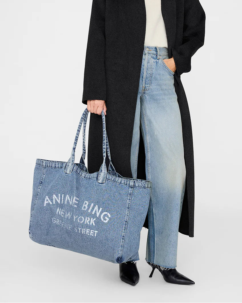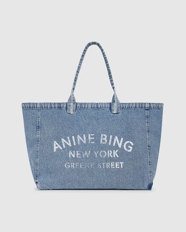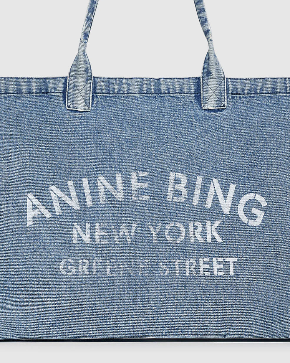 An unlined canvas tote bag featuring an all-over shadow blue denim print and screen-printed ANINE BING branding in contrast white.