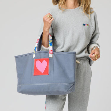 The Love All Over Tote in french blue canvas is gently structured & features an Imperfect Heart Patch Pocket on the font and Love Brigade Taping on the handles. You'll comfortably fit your laptop, spare flats and cosmetics pouch inside.