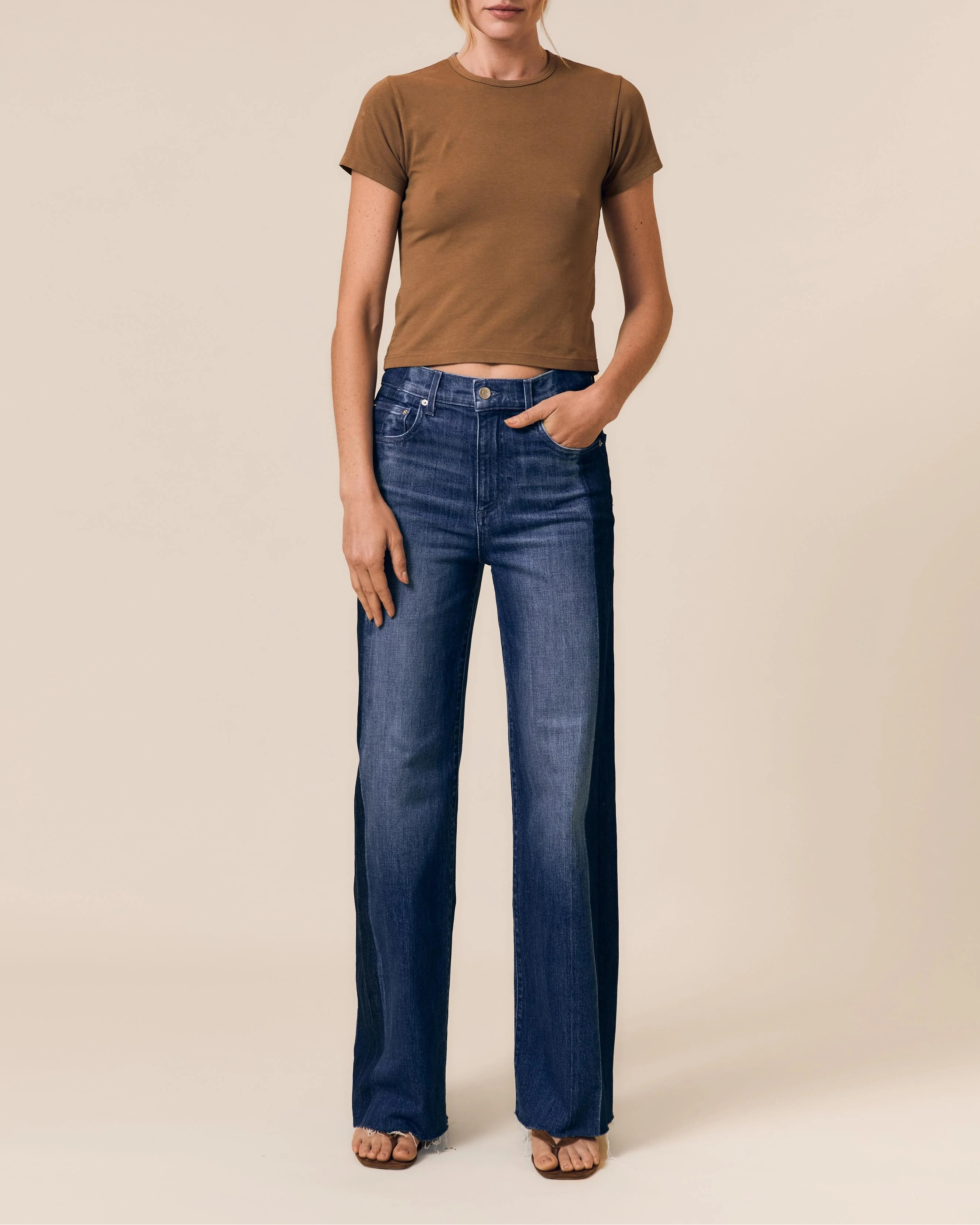 The Column jean is designed with a flattering high rise waist, fitted cut through the hips, and finished with a narrow wide leg silhouette. The rich indigo two tone denim makes them endlessly versatile. Made in Los Angeles.