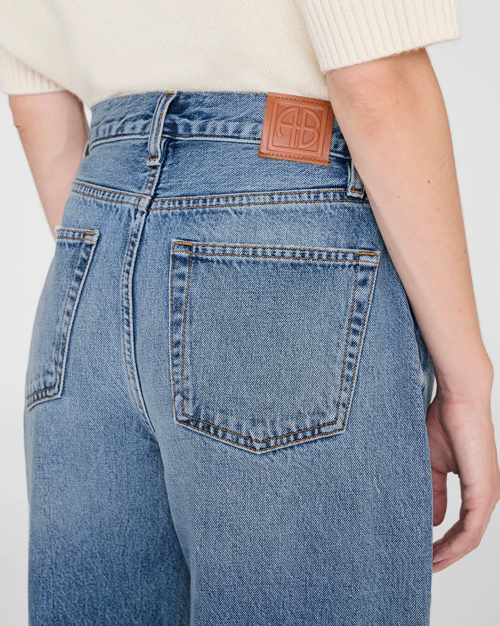 - Regenerative cotton denim- Barrel silhouette- Mid rise- Straight leg- Ankle-length inseam- Clean-edge hem- Non-stretch denim