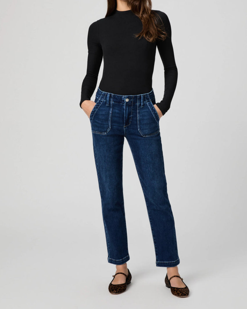 Mayslie is our mid-rise straight ankle pant designed with utility patch pockets. Cut from TRANSCEND VINTAGE denim in a soft, dark wash, this pair combines the signature comfort of Transcend with rich denim character for a lived-in look.