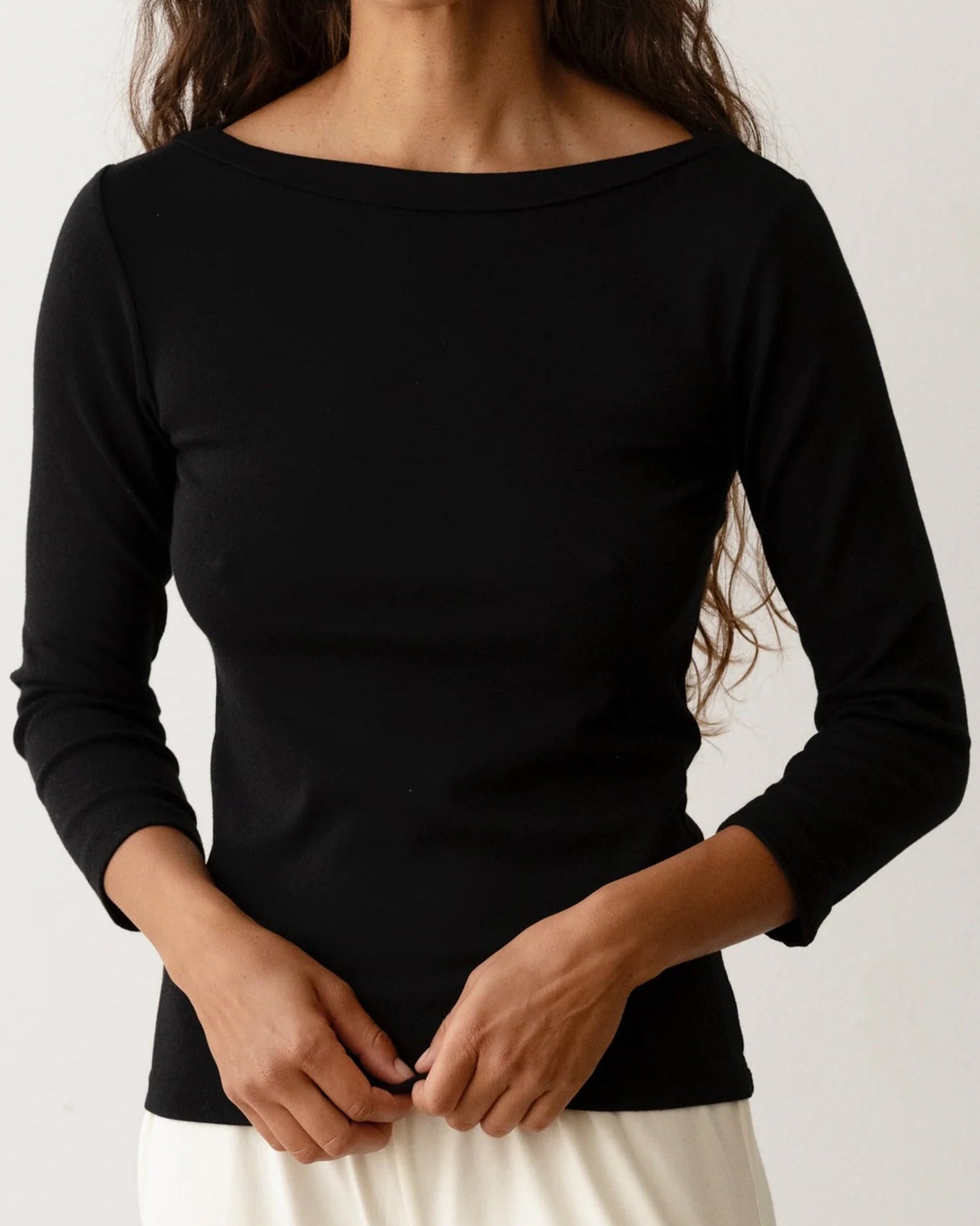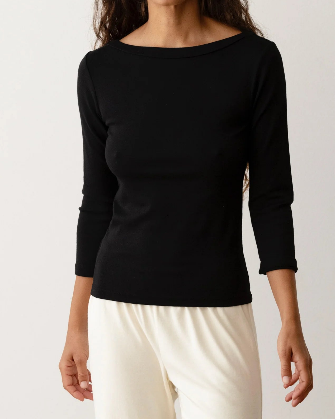 The Baby Rib Boatneck is crafted from our butter-soft baby rib fabric and designed with a boat neckline, ¾ length sleeves, and a flattering full-length fit.