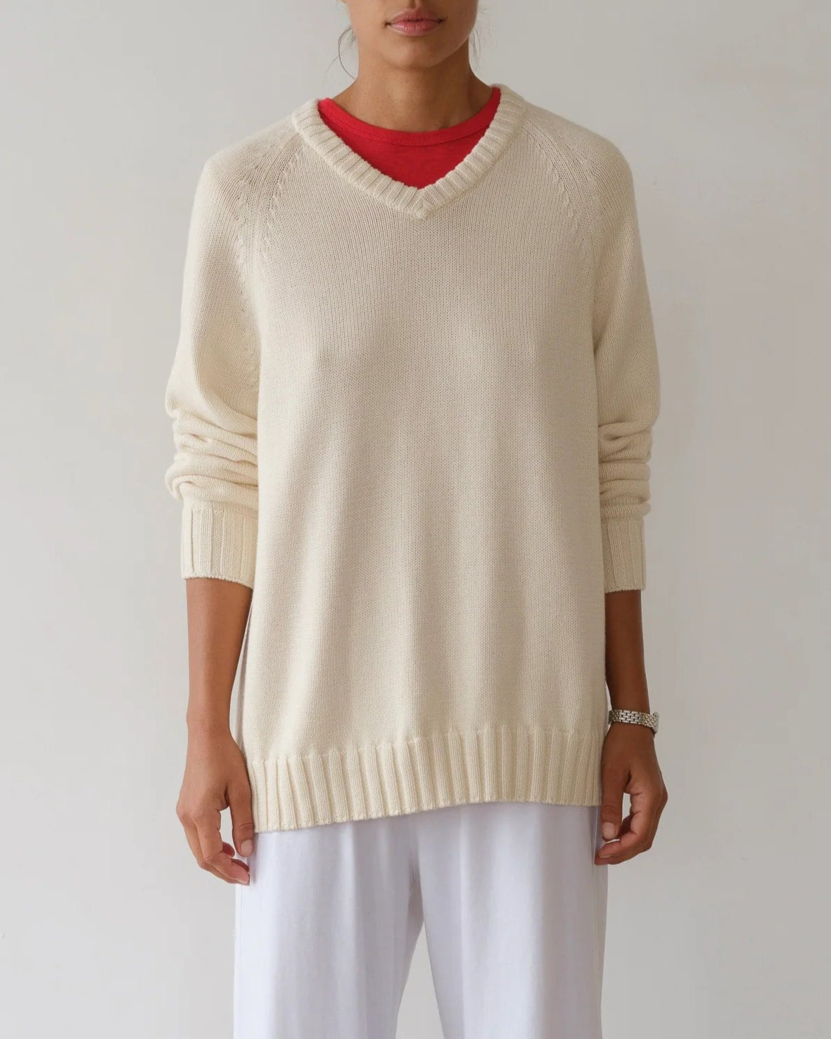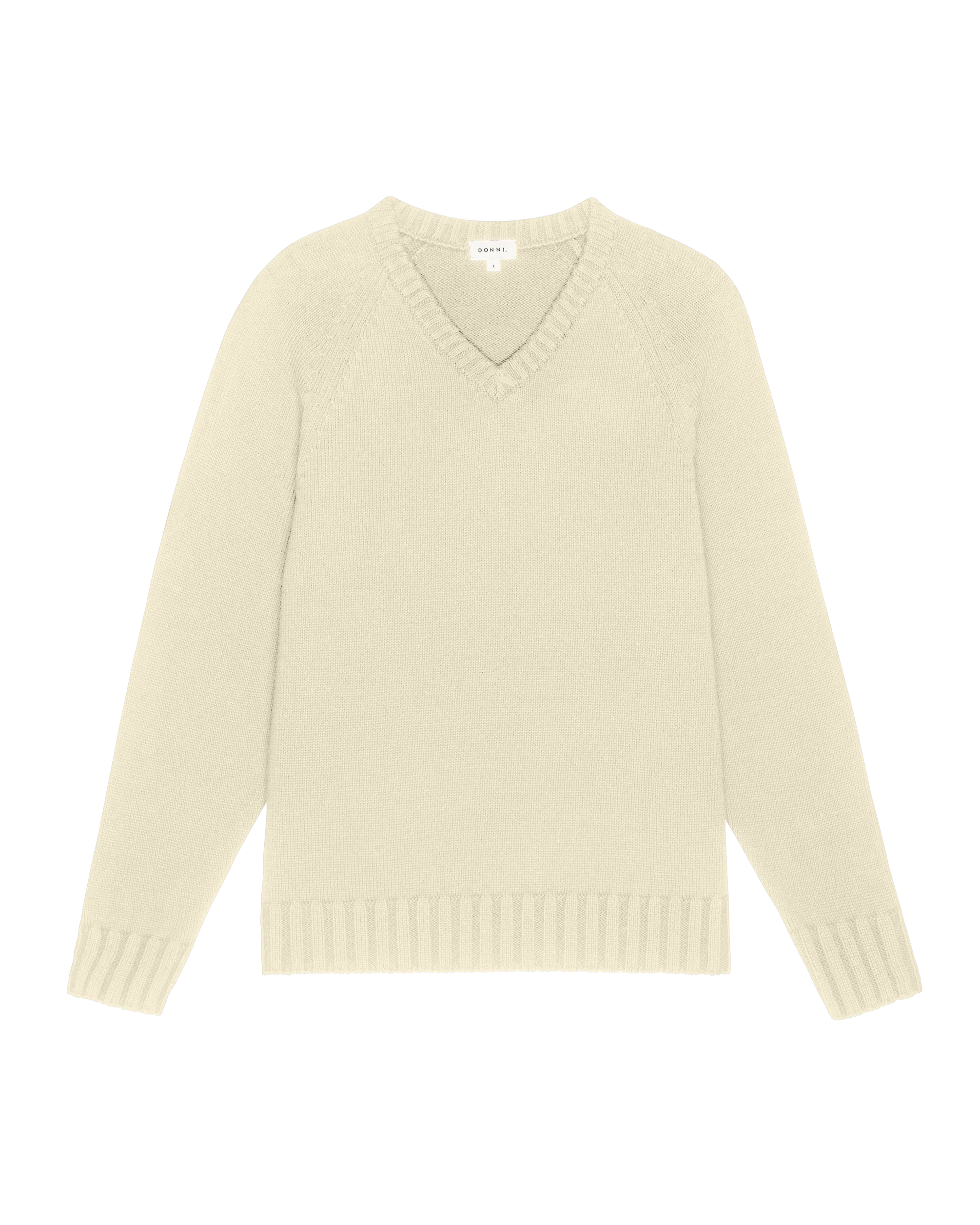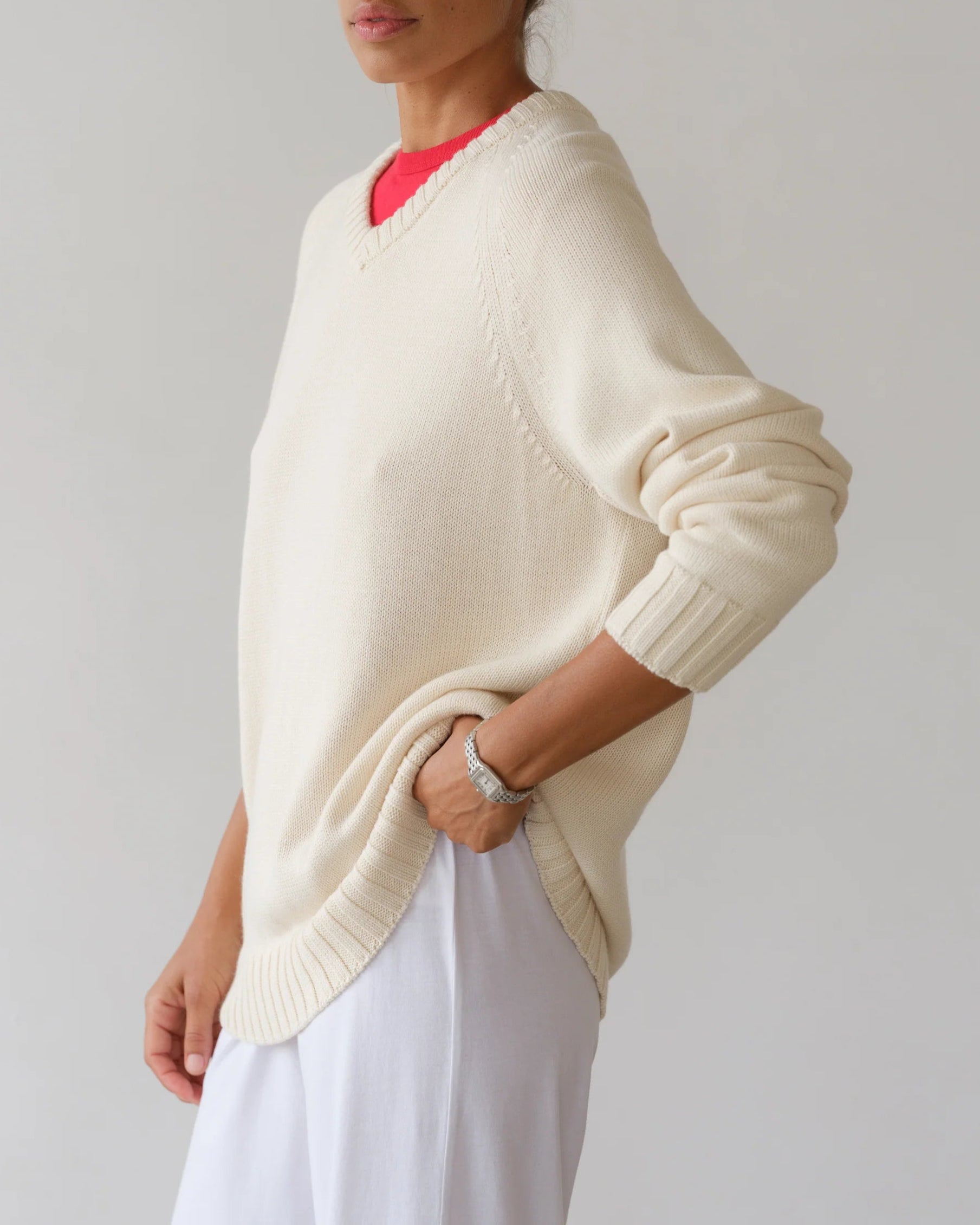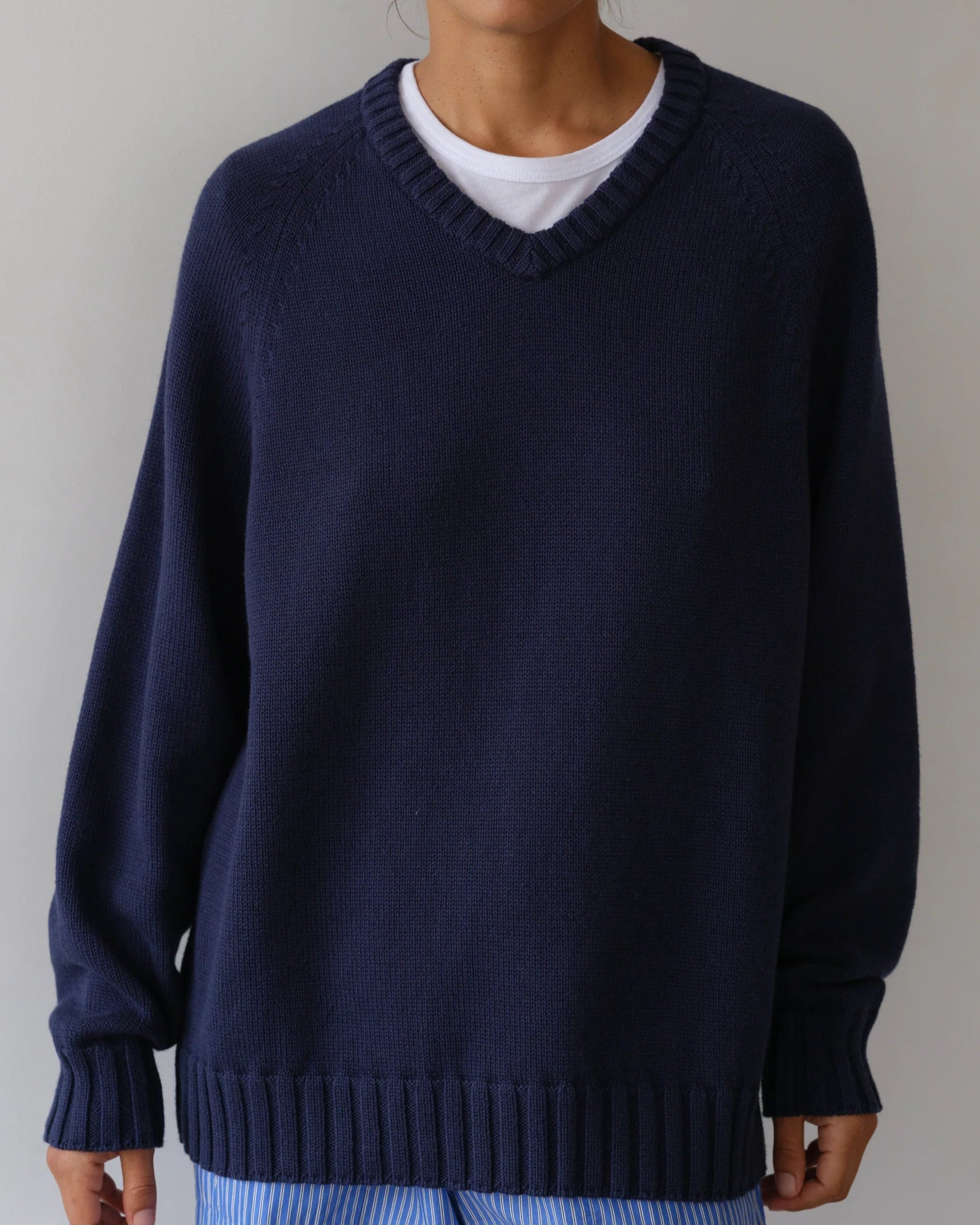 The Cotton Cashmere V-Neck Sweater is crafted from 85% Organic Cotton and 15% Italian cashmere, the perfect balance of softness and warmth. Designed with a relaxed silhouette, v-neck, and finished with ribbed cuffs and collar.