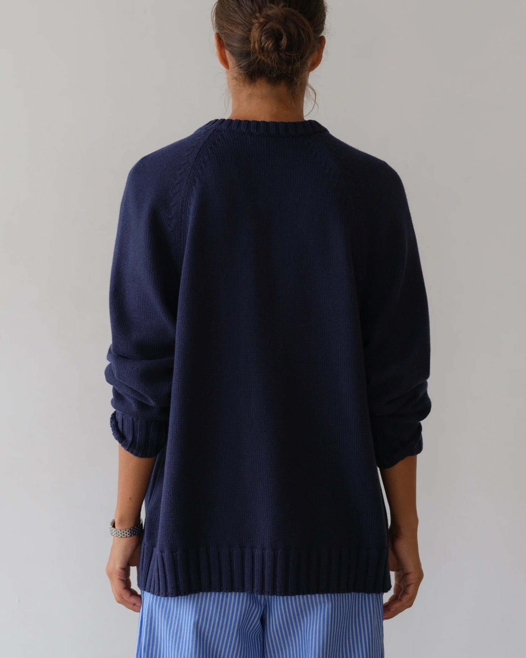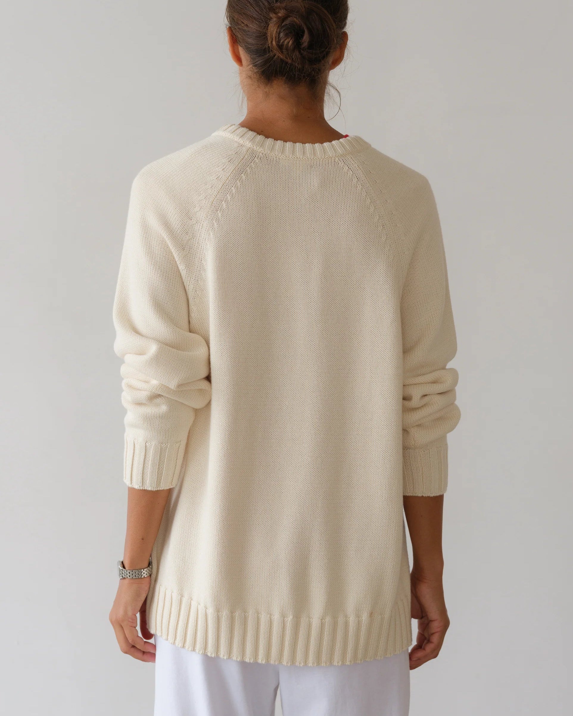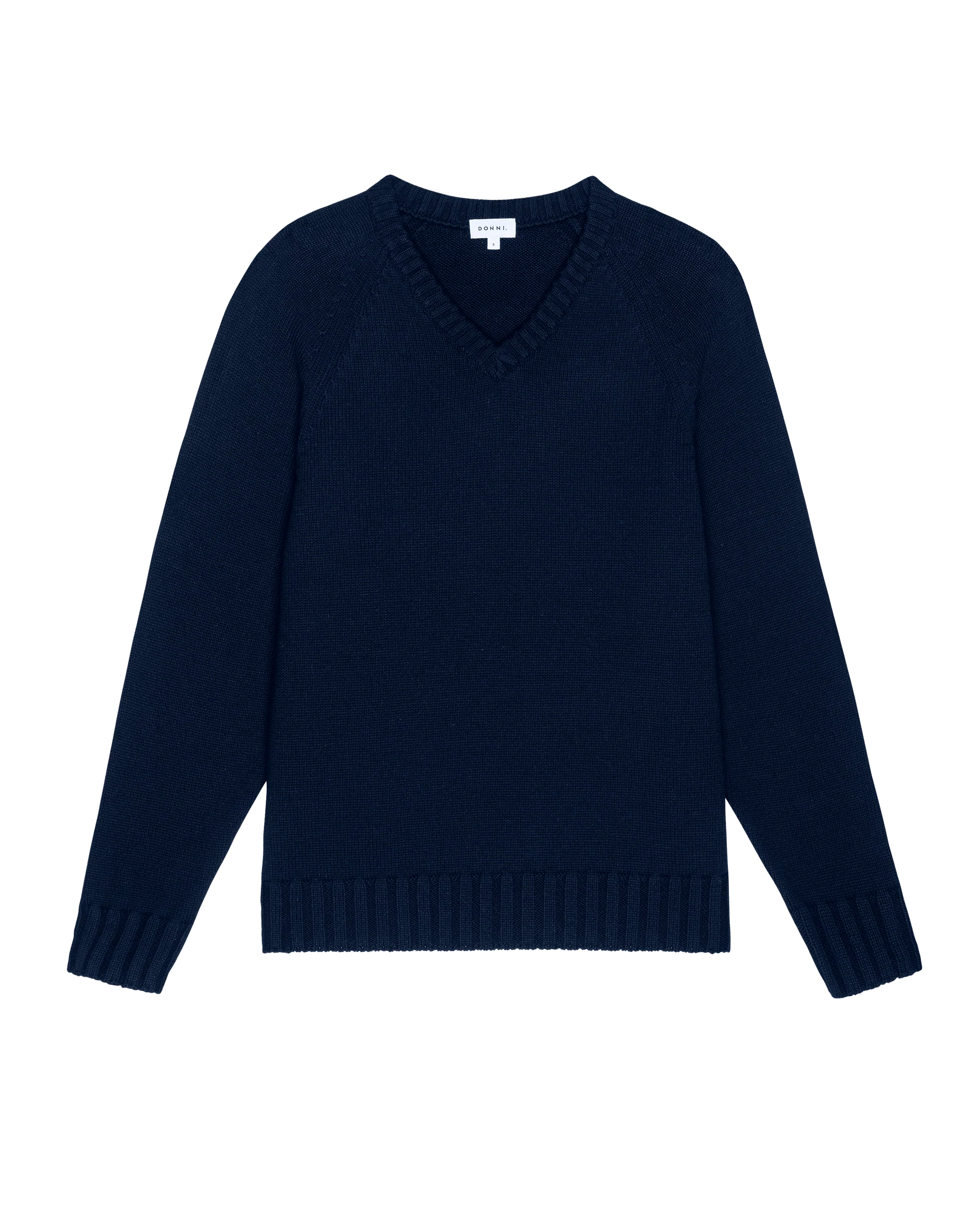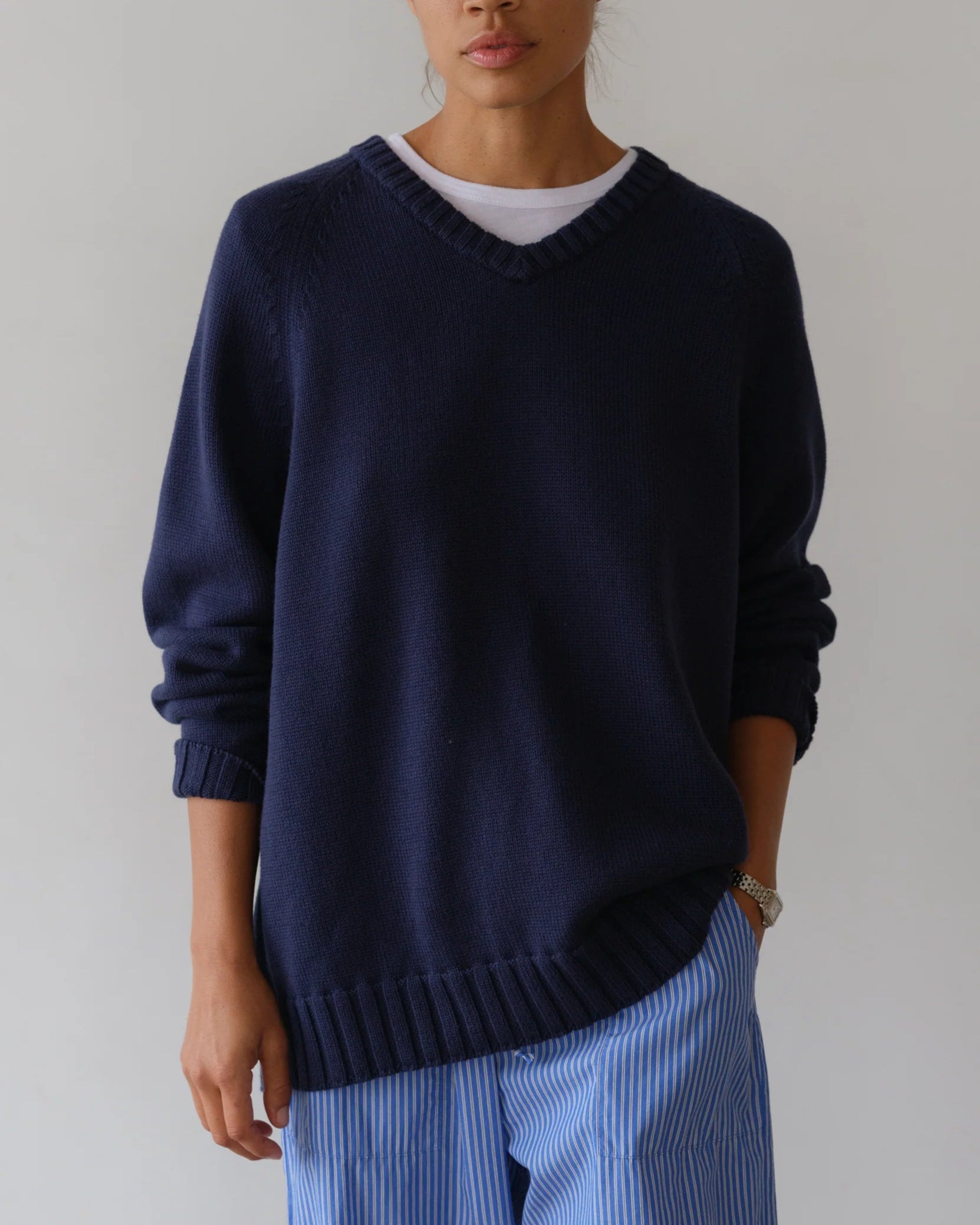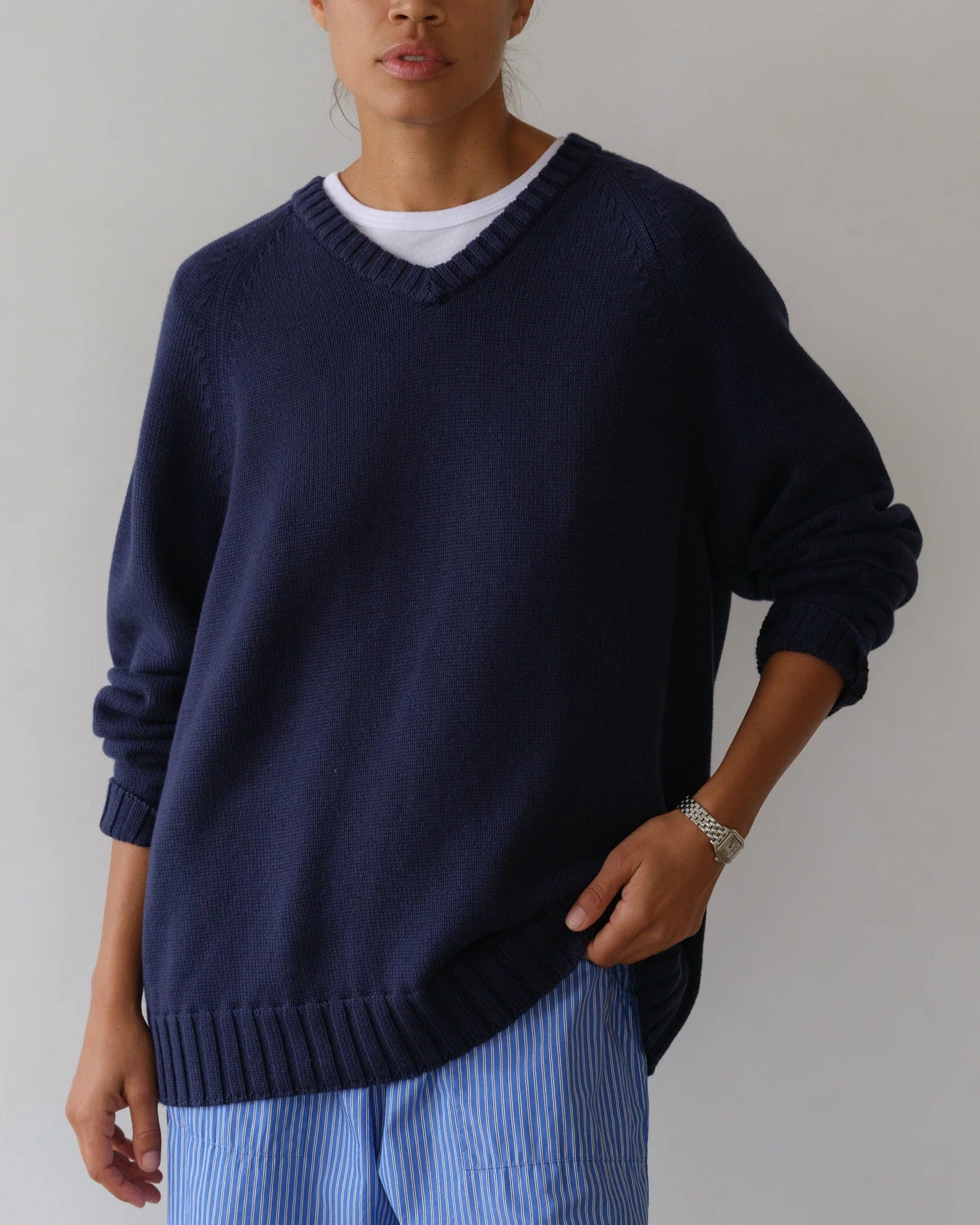 The Cotton Cashmere V-Neck Sweater is crafted from 85% Organic Cotton and 15% Italian cashmere, the perfect balance of softness and warmth. Designed with a relaxed silhouette, v-neck, and finished with ribbed cuffs and collar.