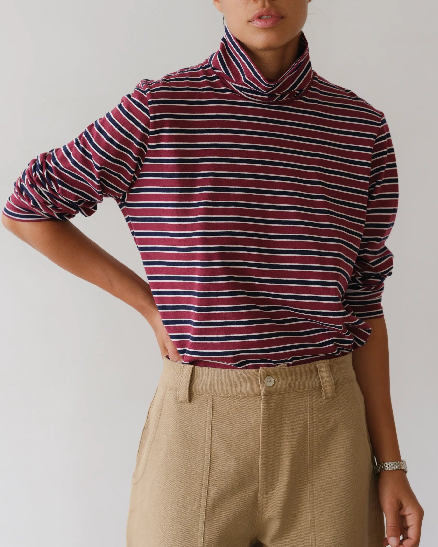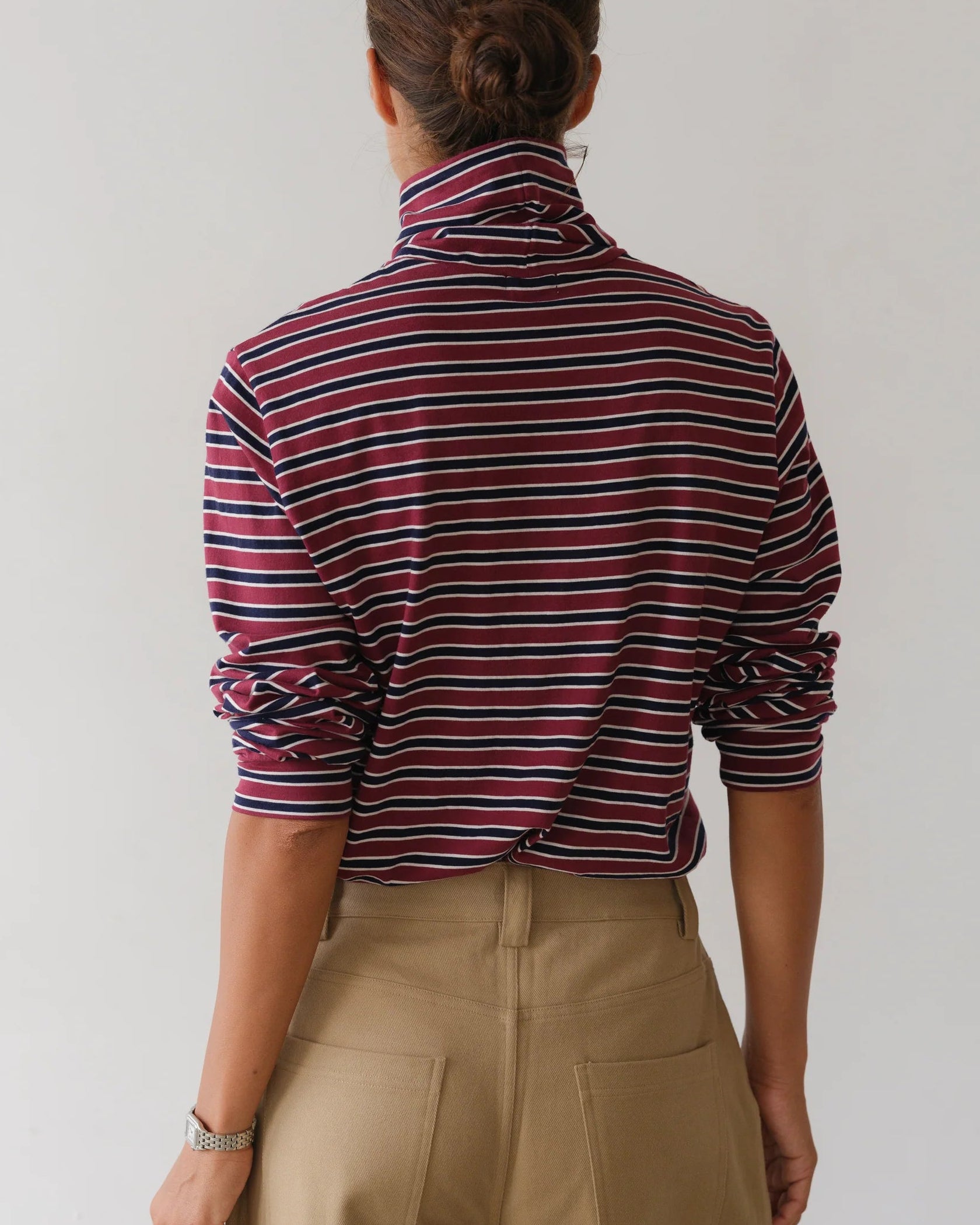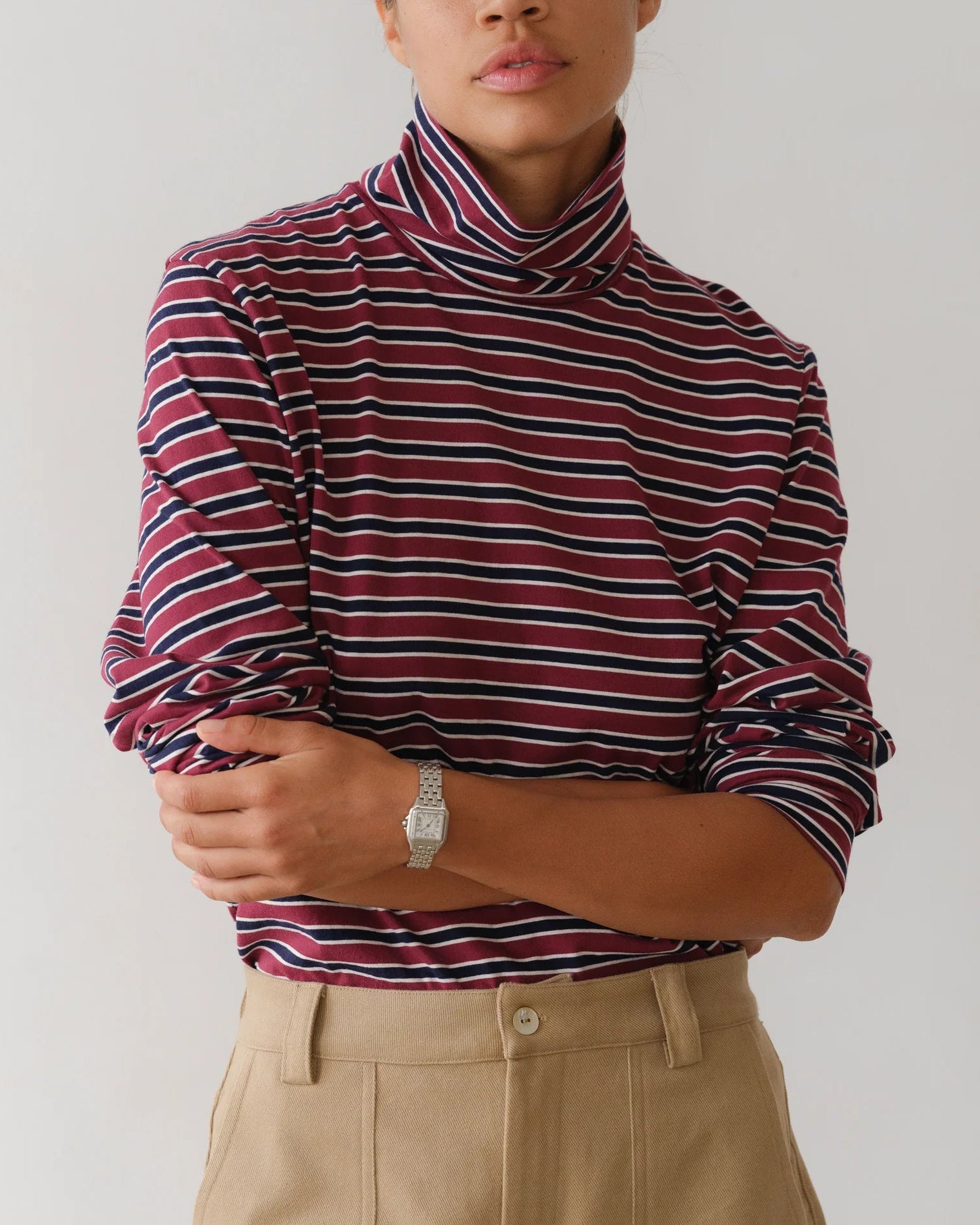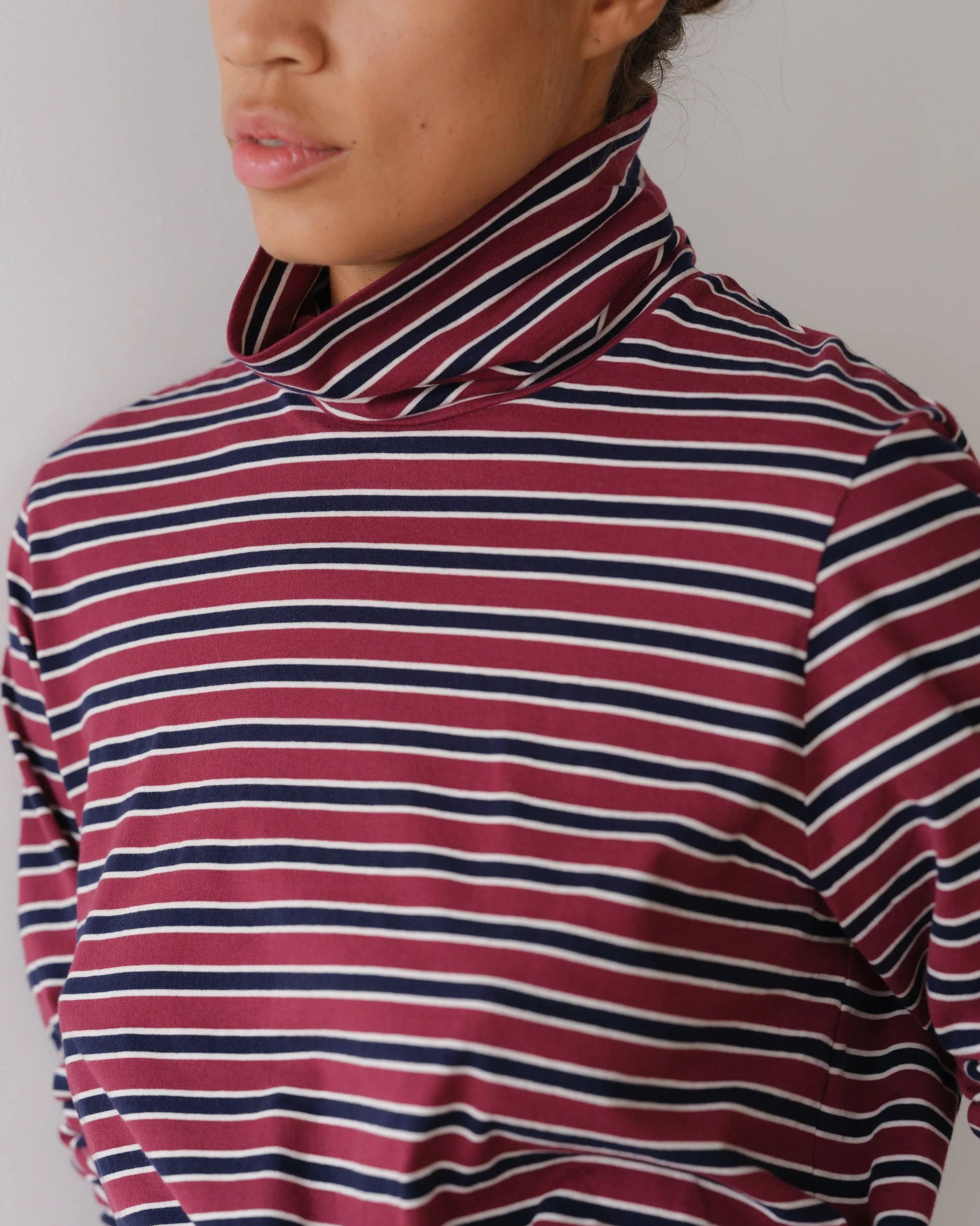 Crafted from ultra-soft and lightweight supima cotton jersey, The Stripe Jersey Turtleneck | Oxblood is a cozy turtleneck and a slim, flattering fit. A timeless, feel-good layer you'll wear on repeat.