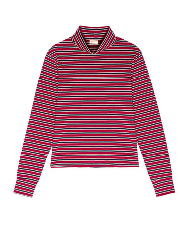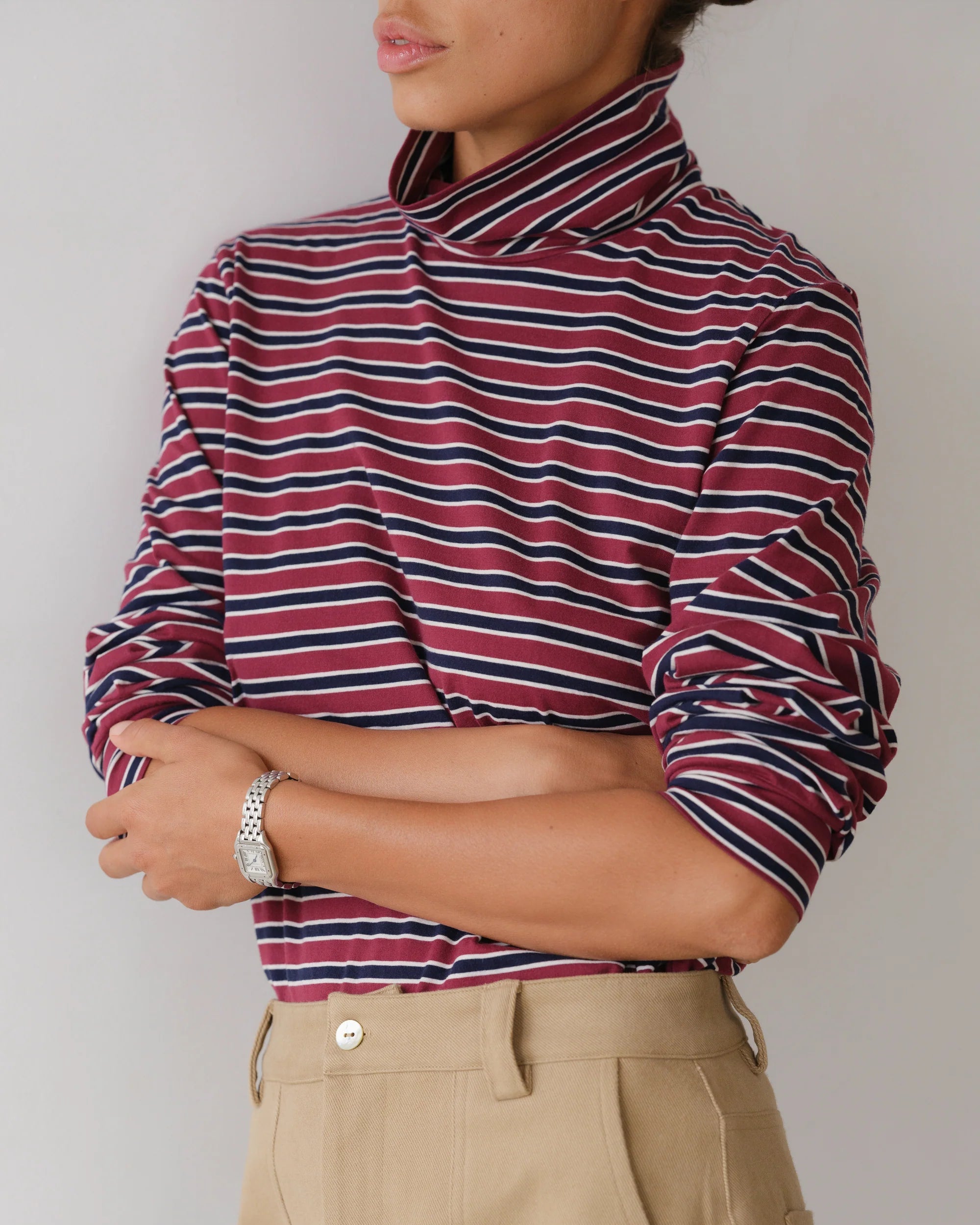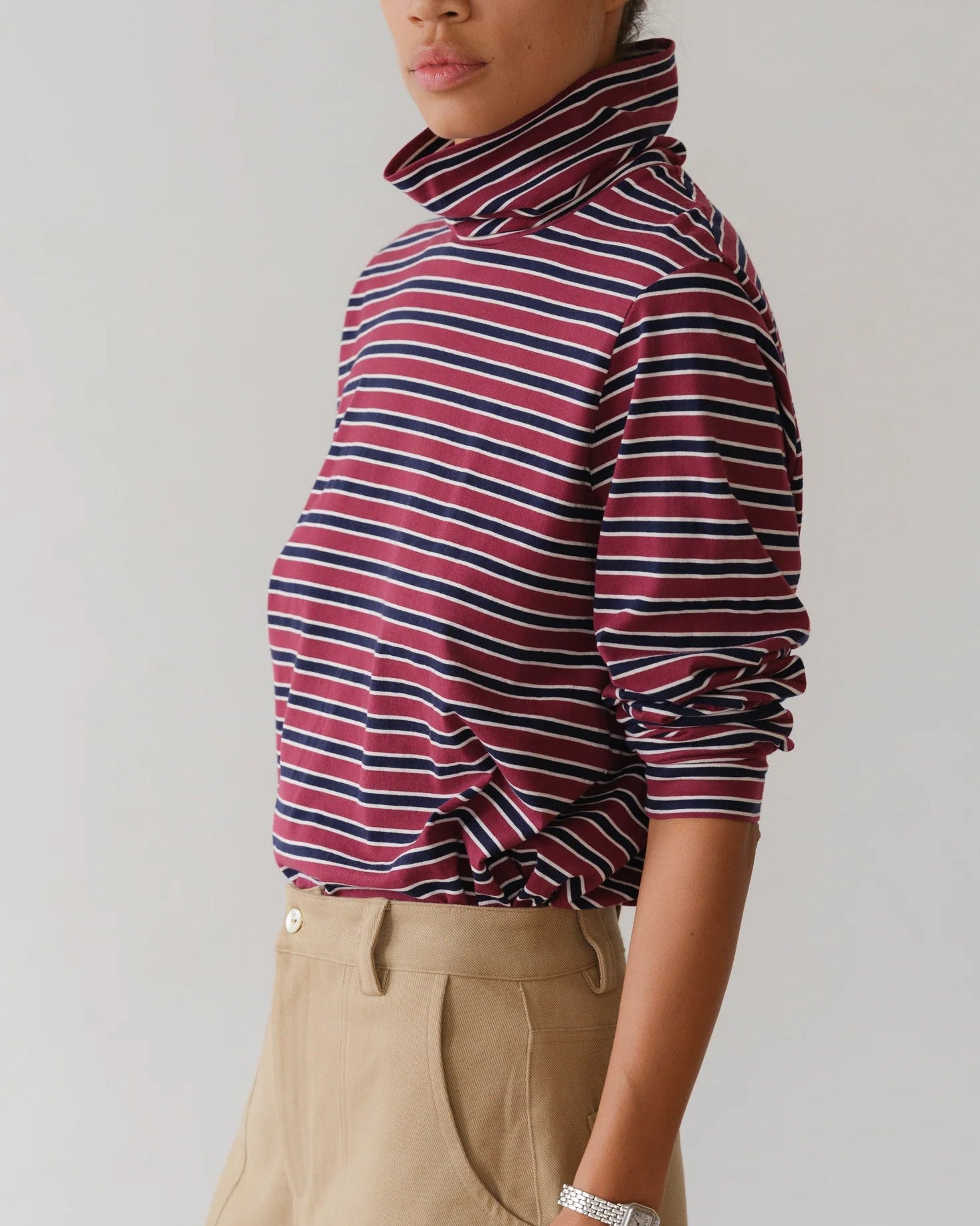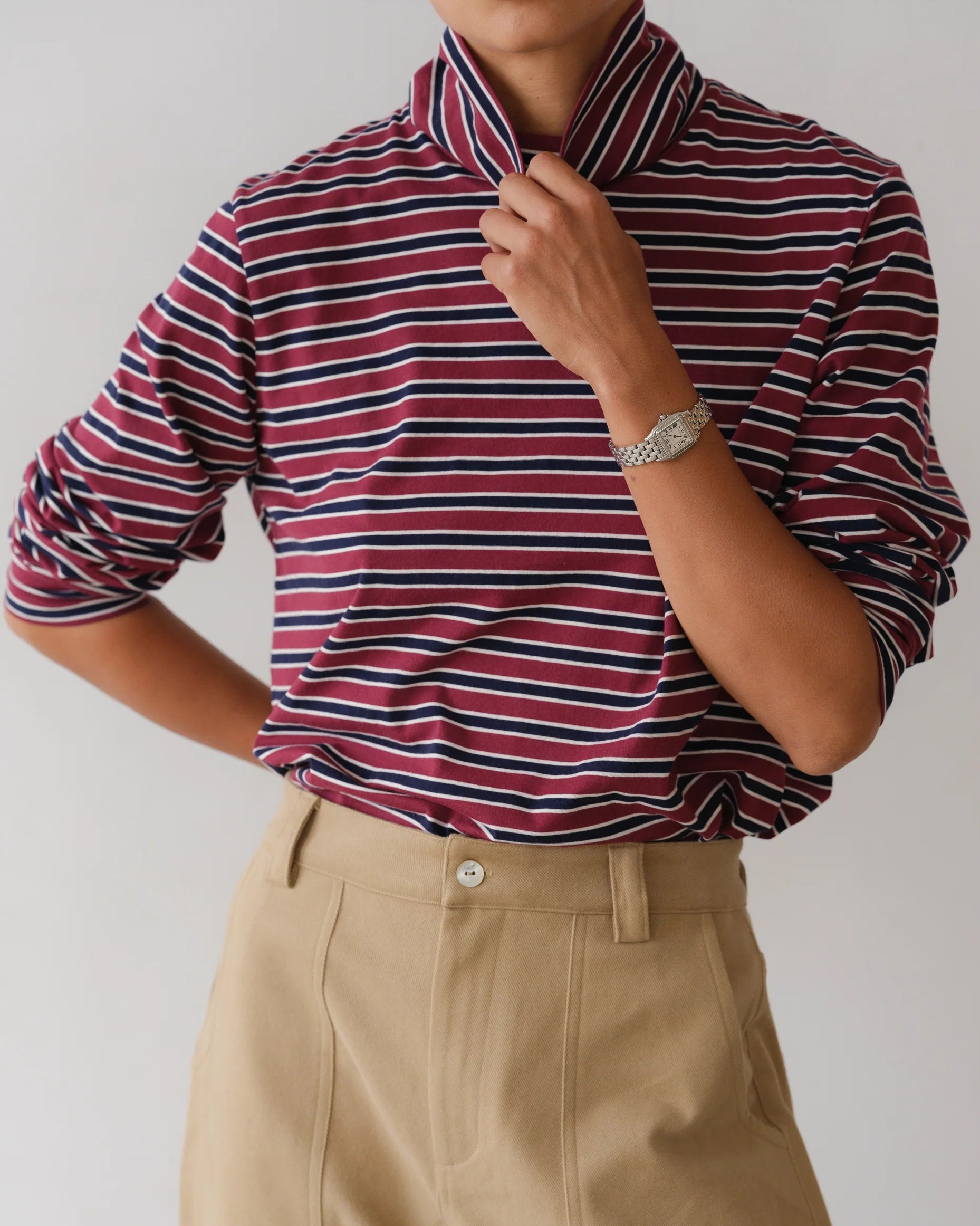 Crafted from ultra-soft and lightweight supima cotton jersey, The Stripe Jersey Turtleneck | Oxblood is a cozy turtleneck and a slim, flattering fit. A timeless, feel-good layer you'll wear on repeat.