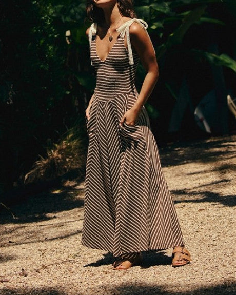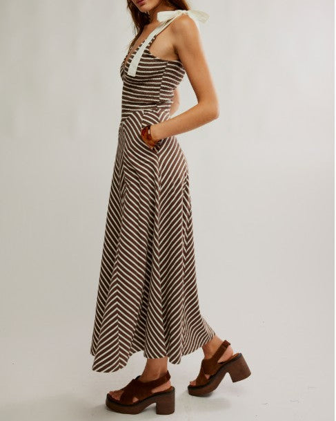 Flattering smocking and shoulder bow details make this drop-waist midi dress from free-est an easy, effortless option.