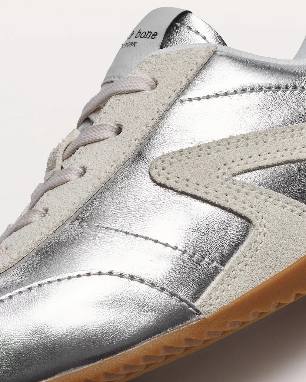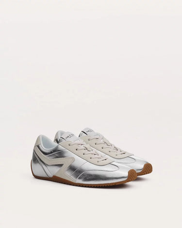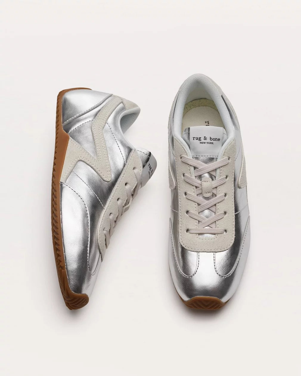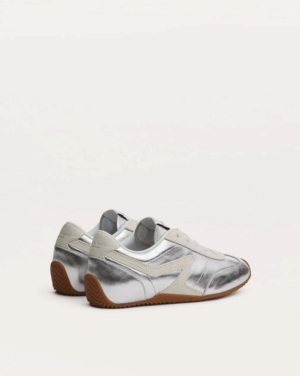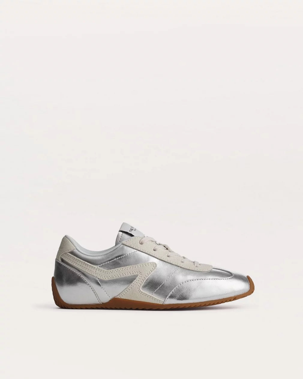 Our (slimmest) take on a classic, old-school trainer. These lace-up sneakers are crafted from metallic leather with soft suede trims. Inside, you'll find dual-density antimicrobial foam insoles: OrthoLite® Lazy-Hybrid™ for custom-fit comfort, and OrthoLite® Recycled for stability and support. Together, they deliver that "new sneaker feel" with every step.