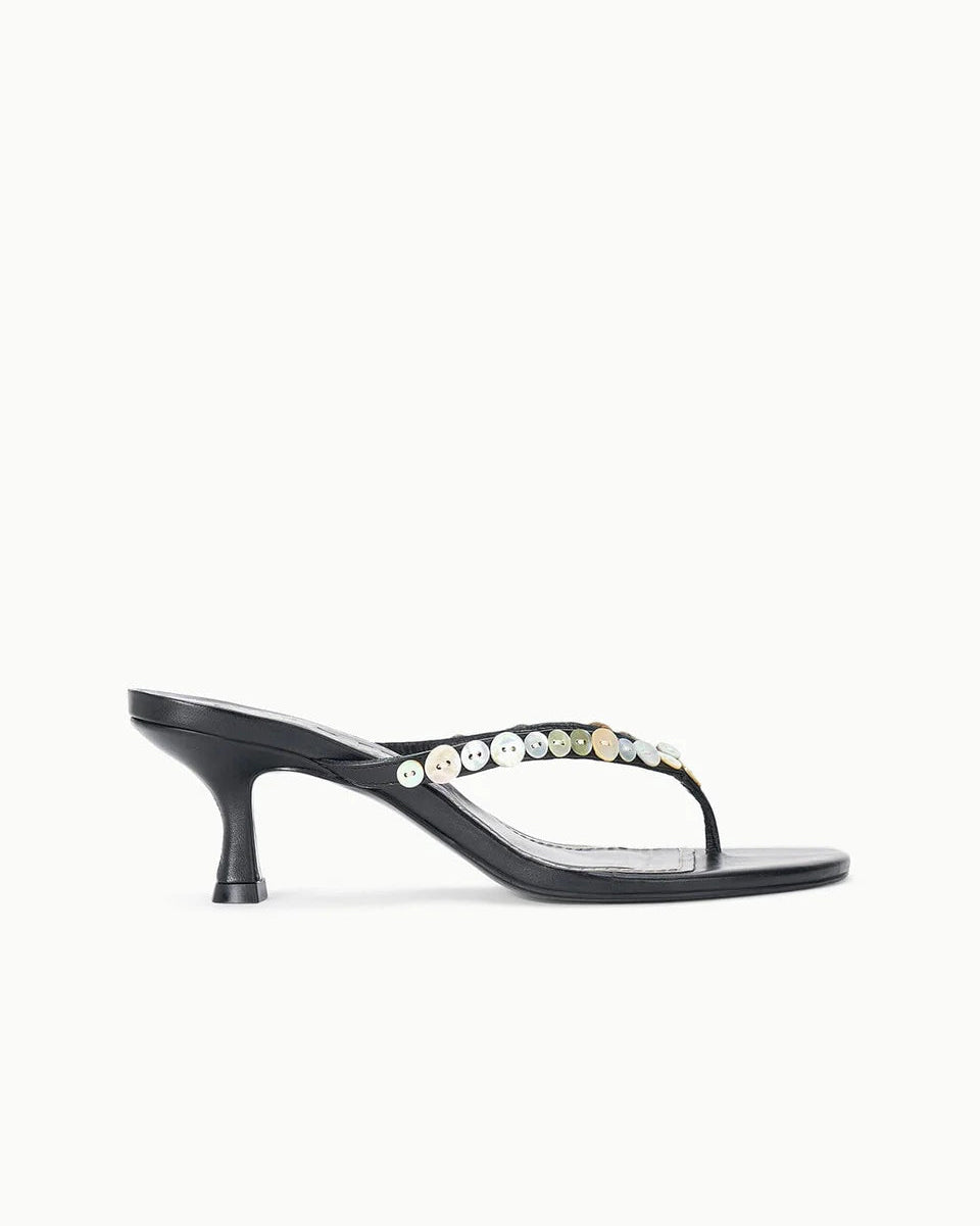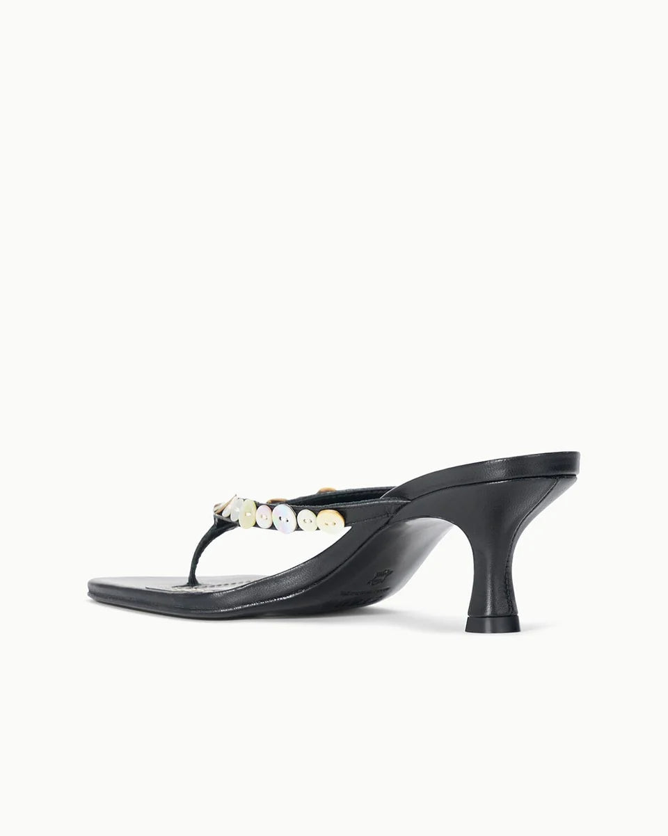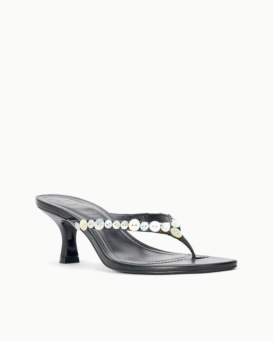 A delicate thong-style kitten heel crafted in supple leather with a striking mother of pearl button detail at the upper. The modest heel offers all-day comfort while the refined silhouette makes it effortlessly versatile—perfect for elevating casual looks or adding understated elegance to dressier occasions.