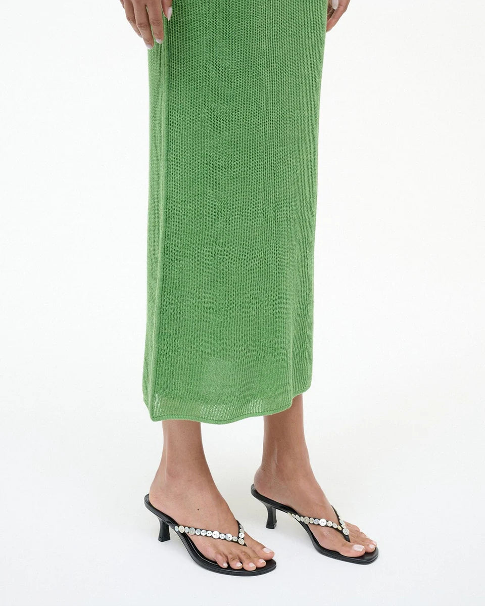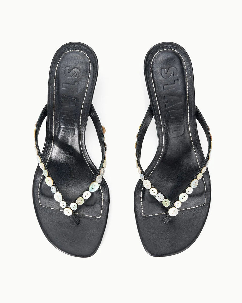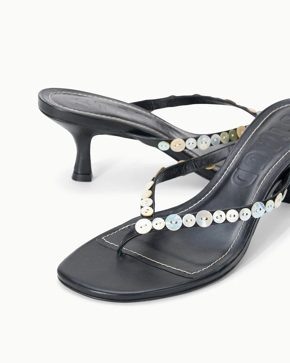 A delicate thong-style kitten heel crafted in supple leather with a striking mother of pearl button detail at the upper. The modest heel offers all-day comfort while the refined silhouette makes it effortlessly versatile—perfect for elevating casual looks or adding understated elegance to dressier occasions.