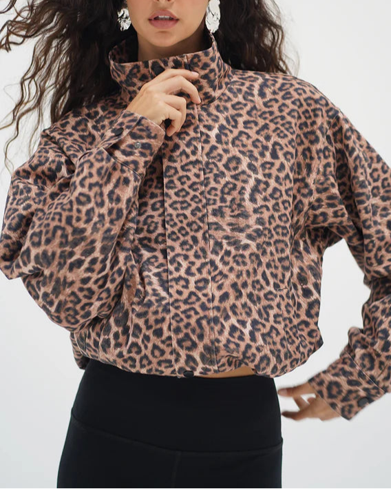 The Broadway Jacket returns for a limited time in leopard print. Made in cotton canvas fabric and lined with a cotton jersey. This jacket has a hidden zip front and a drawstring bottom to adjust the bottom fit.