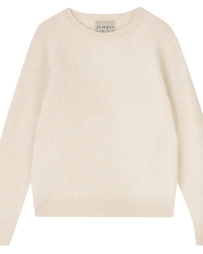 Jumper 1234 cashmere jumper. Cashmere Brushed Crew neck jumper in cream. Brushed cashmere is super soft, once the jumper is knitted it is then brushed to give it a more fluffy handle. We're in love with this jumper.