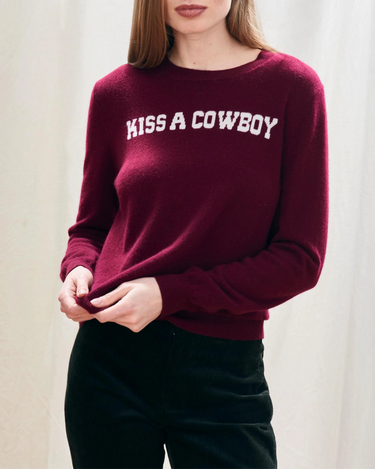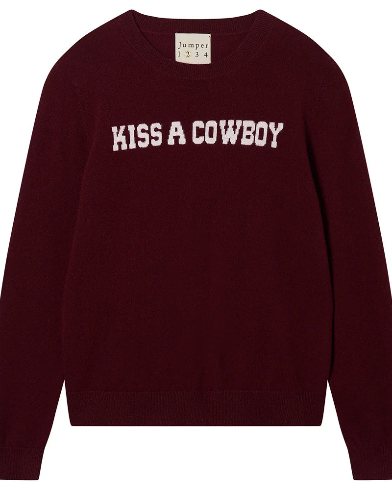 Jumper 1234 cashmere and wool jumper. Burgundy crew neck jumper with cream 'kiss a cowboy' intarsia. A little bit tongue in cheek, a lot Jumper 1234!