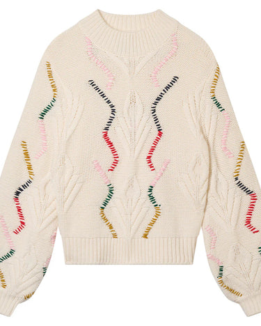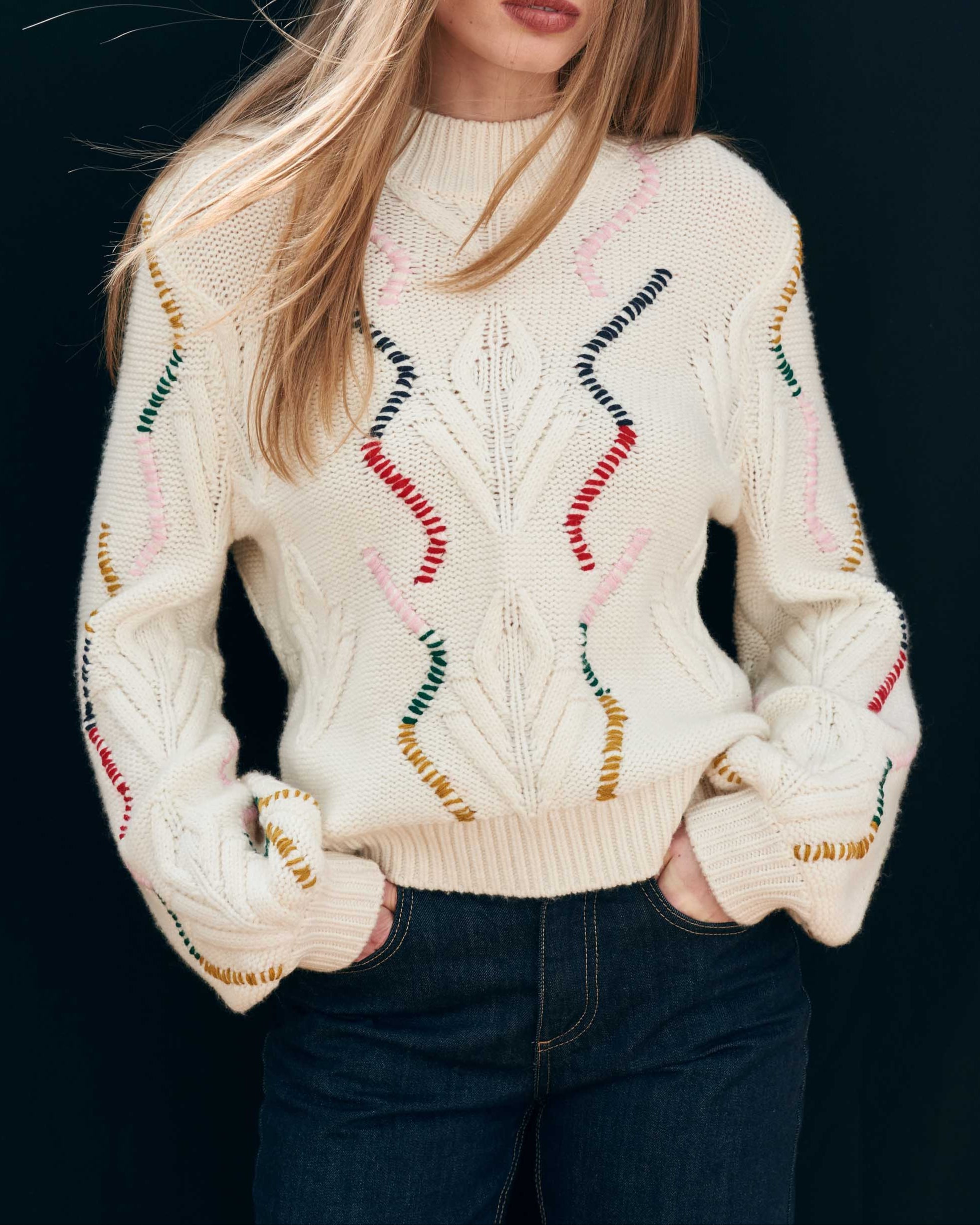 Jumper 1234 cashmere and wool jumper. Heavy weight Aran jumper in cream with multi colour stitch details, Balloon sleeves and a turtle neck, Slightly oversize fit and also available in charcoal and moose. Heaven in a jumper?