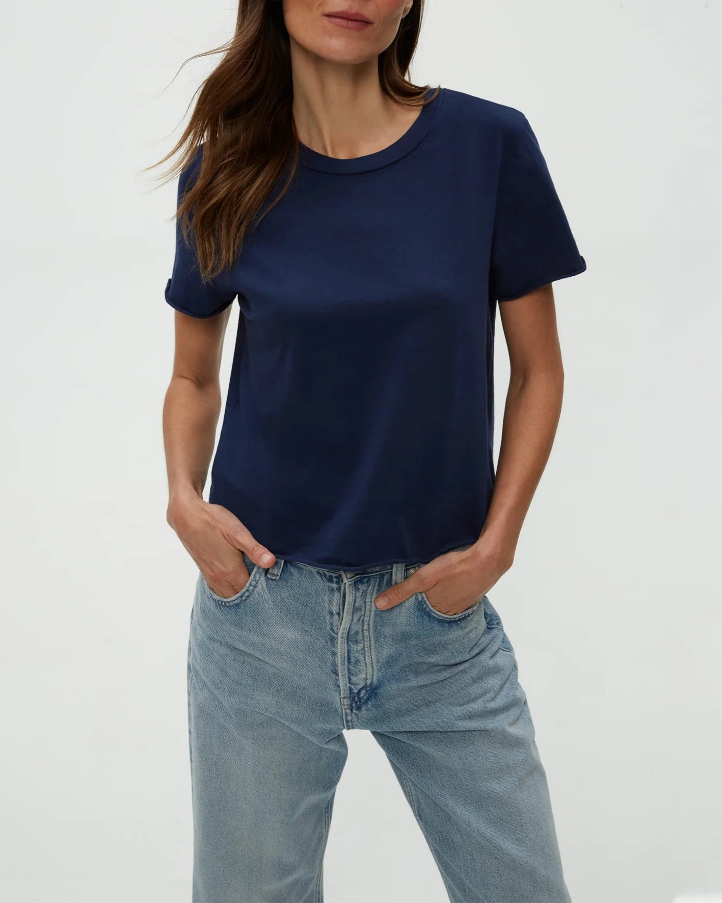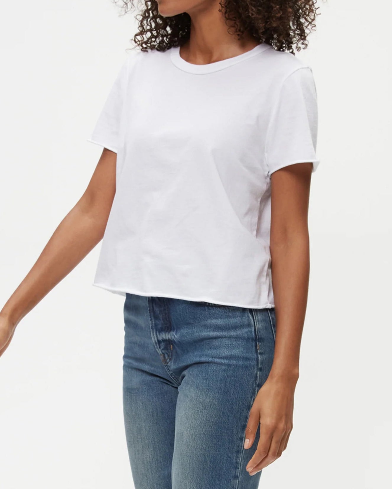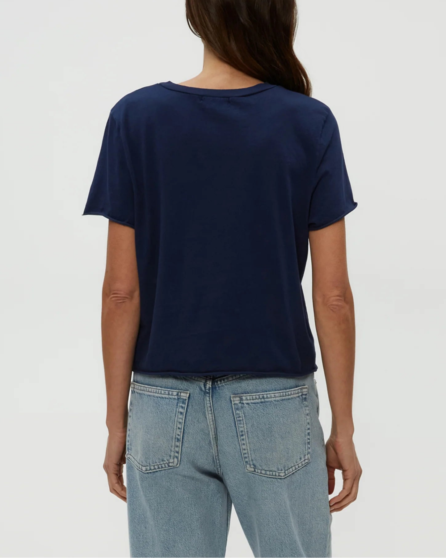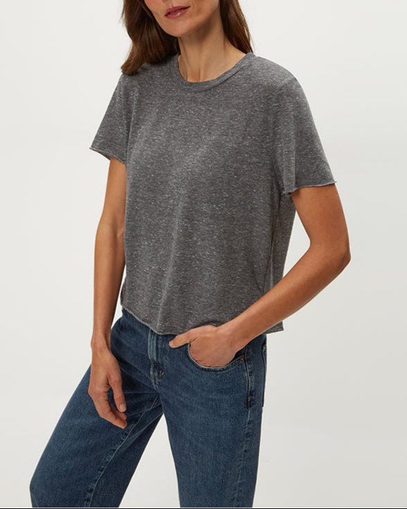 The cropped version of the Becca Tee, Jackie Raw Edge Crew Neck Tee is a short sleeved, easy fitting crewneck with rolled hems at the sleeves and bottom hem. A tee that’s made in LA and made to last.