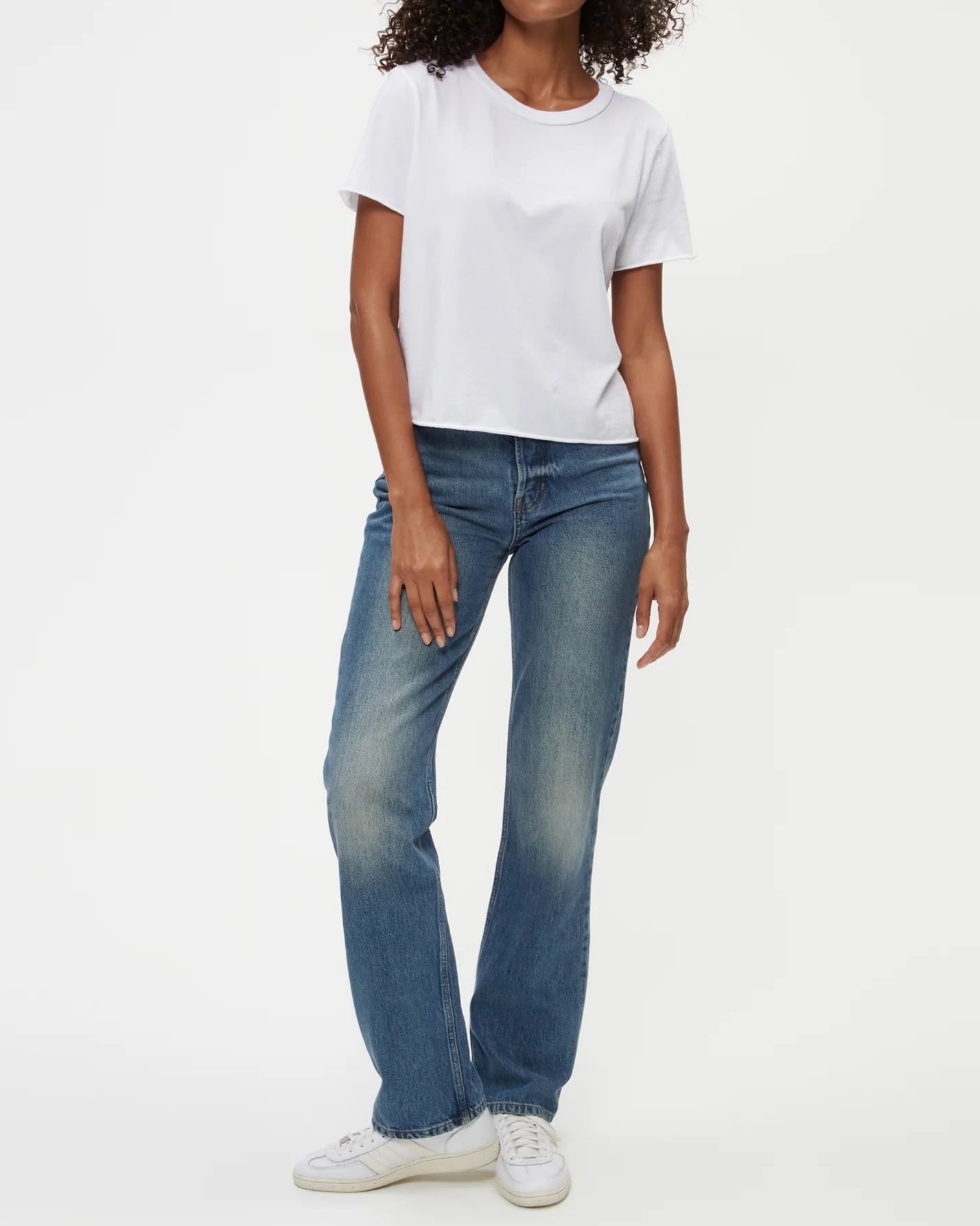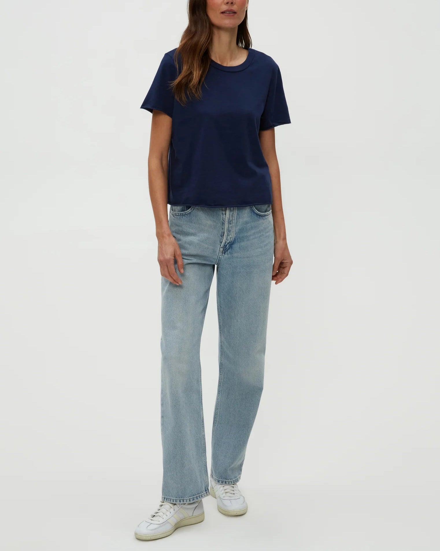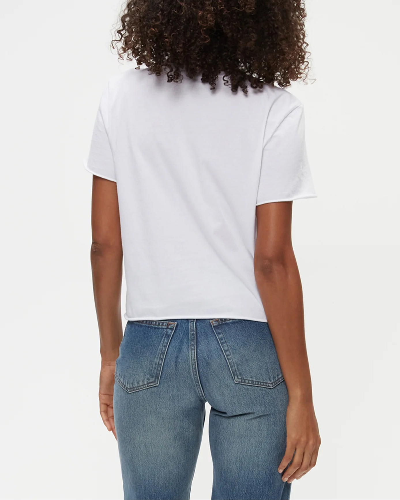 The cropped version of the Becca Tee, Jackie Raw Edge Crew Neck Tee is a short sleeved, easy fitting crewneck with rolled hems at the sleeves and bottom hem. A tee that’s made in LA and made to last.