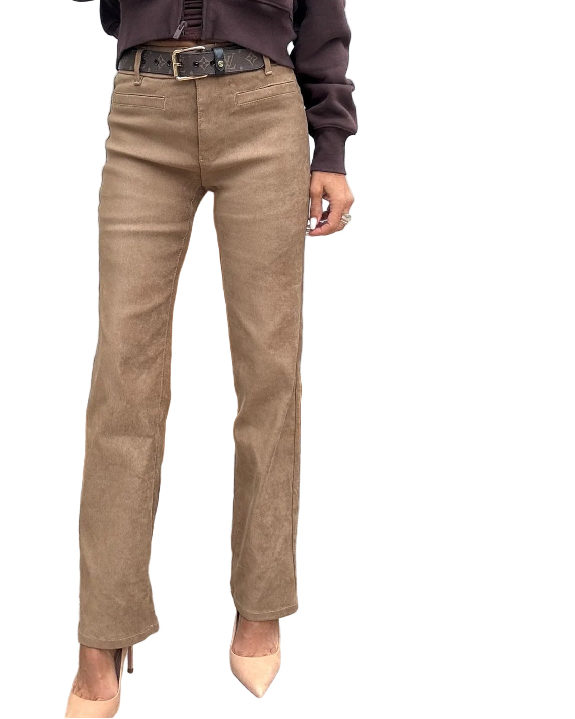 Tami Camel Velvet Suede Feel, elastic waist, functional button and zipper. Flared bottom with a functional slit front pocket. Camel Velvet Suede Feel. 98% cotton 2% Lycra. Machine washable. Does not wrinkle or fade. Comfortable, stylish, and very flattering. Wear with or without belt. Wear with sneakers, sandals, booties, or heels. Wear it casual or dressy for evening. Try them and you will see why these pants have been the #1 selling item in boutiques all around the U.S. Inseam: 30", Rise: 10".