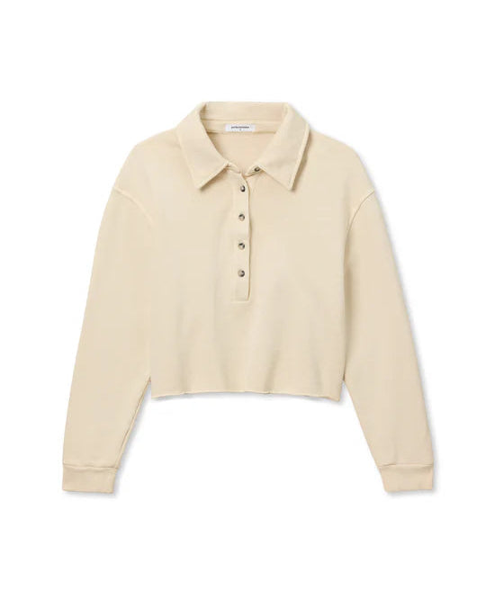 the vinny top is crafted from heavy fleece and finished with a raw hem for a relaxed, lived-in look. designed with a collared neckline and button placket, it brings a polished touch to a casual silhouette.