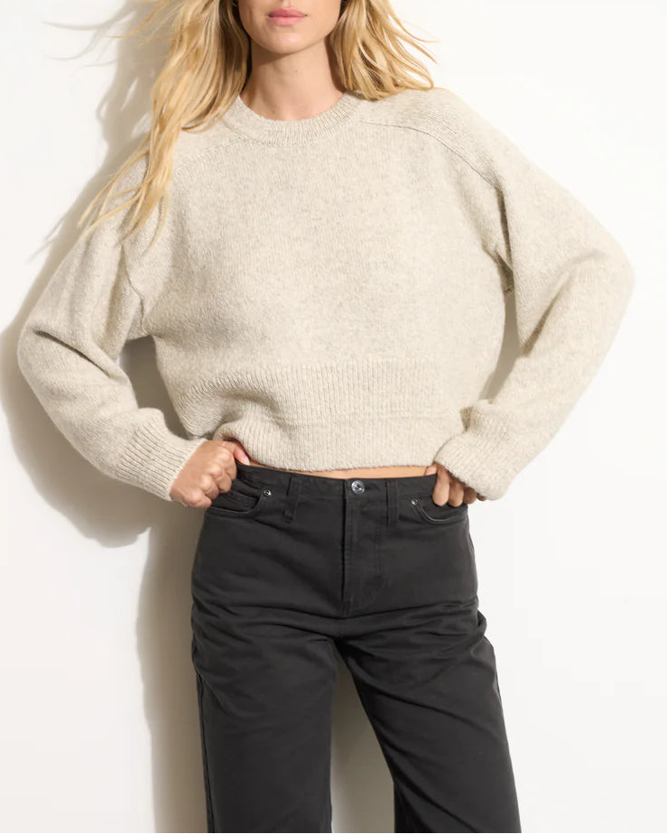 The boxy, slightly cropped silhouette, accented with soft, square-shaped "saddle-shoulder" raglan sleeves, exudes laid-back refinement, while a wide ribbed crew neck and reflexed sleeve cuffs add subtle structure. The Marfa is ideal for layering over a button-up or dress, giving you timeless comfort with a modern edge.