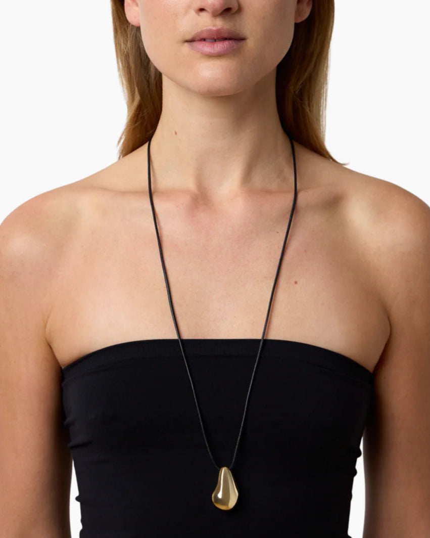 The Betty Necklace | Gold embodies understated luxury with a curved pendant that moves gracefully with you. It is designed to be as adaptable as your summer plans, wear it around your neck, style it as an anklet, or let it accompany you as a bag charm. The Betty Necklace includes both a delicate chain crafted from 18 carat gold-plated silver and a sleek leather strap, offering versatile styling options.