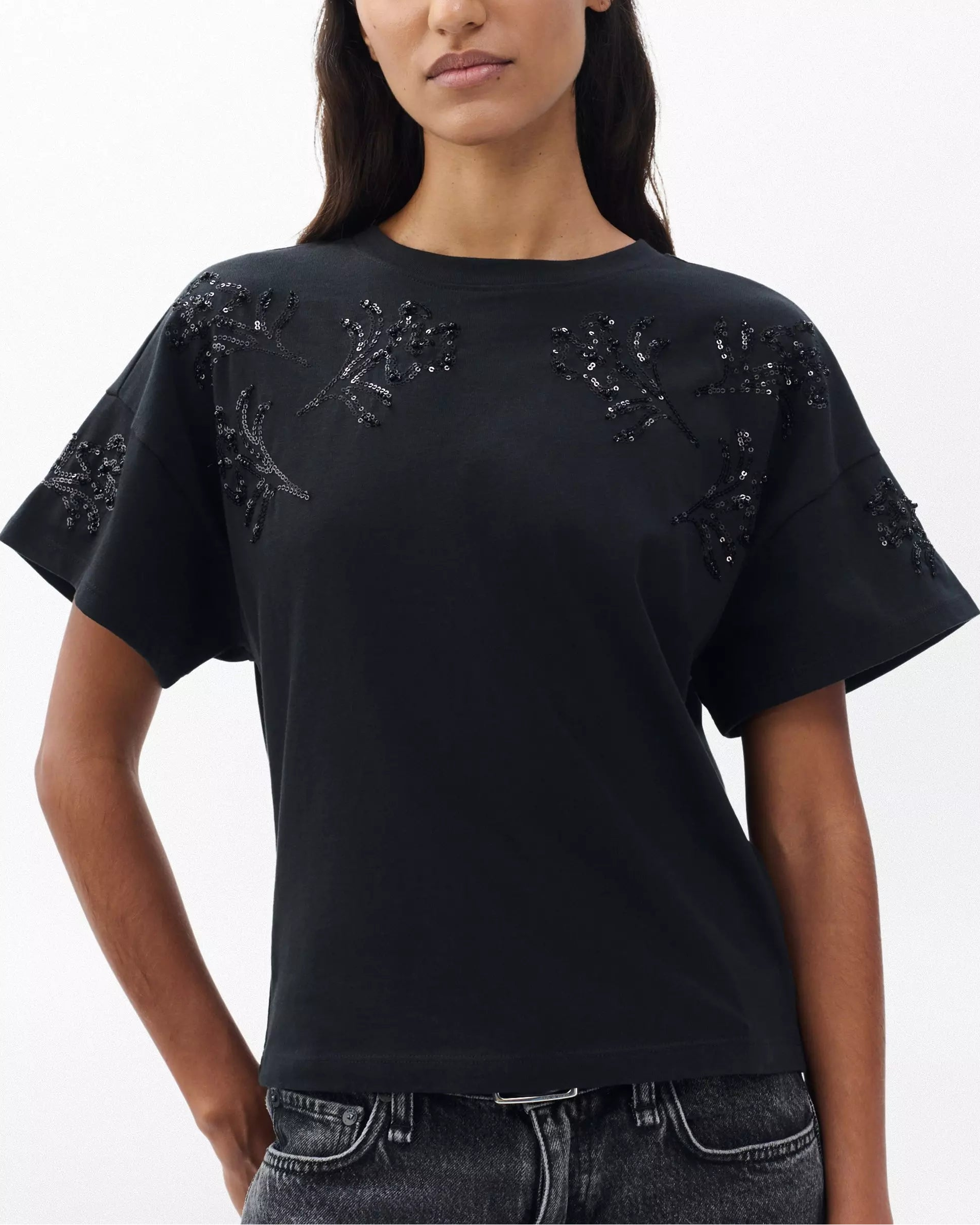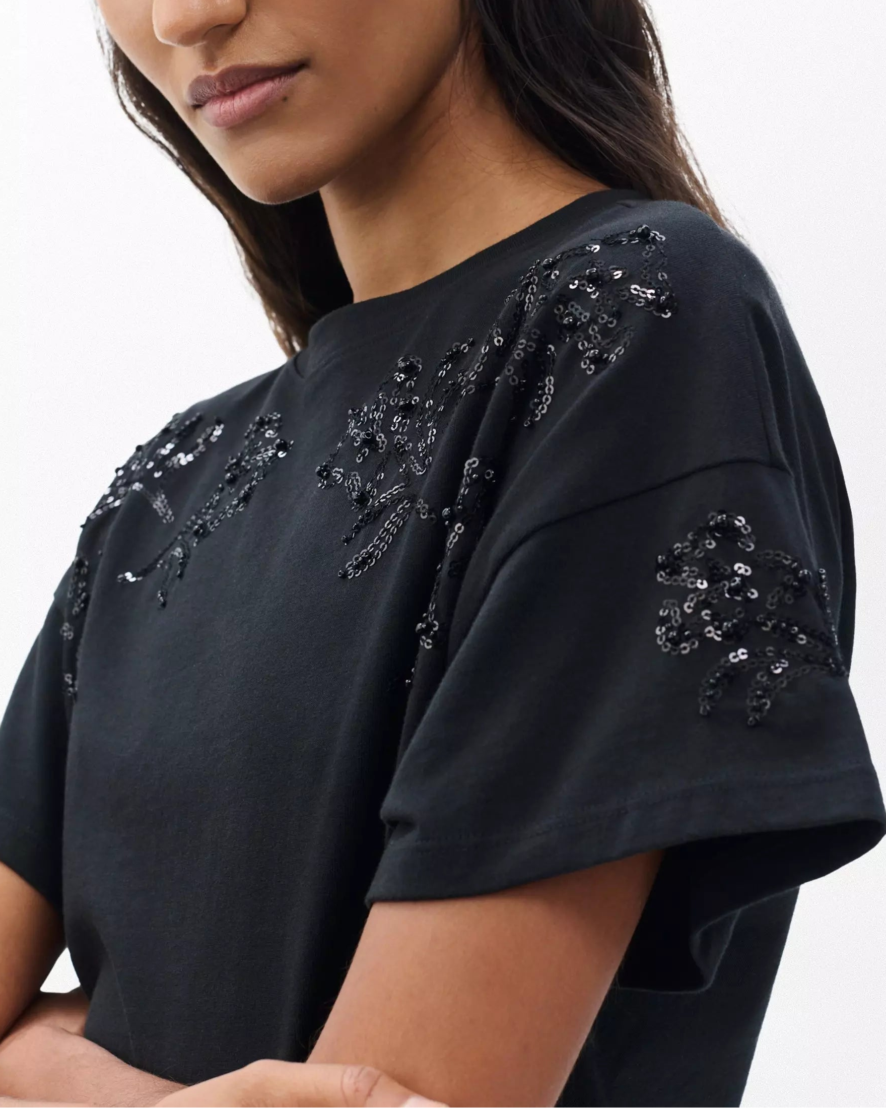 Subtle statement. Tonal hand-beaded and sequined floral motifs bloom across the top and sleeves of this boxy short-sleeve T-shirt cut from soft Peruvian cotton. Wear the glamorous style with denim during the day, or with a black satin skirt for festive parties at night.
