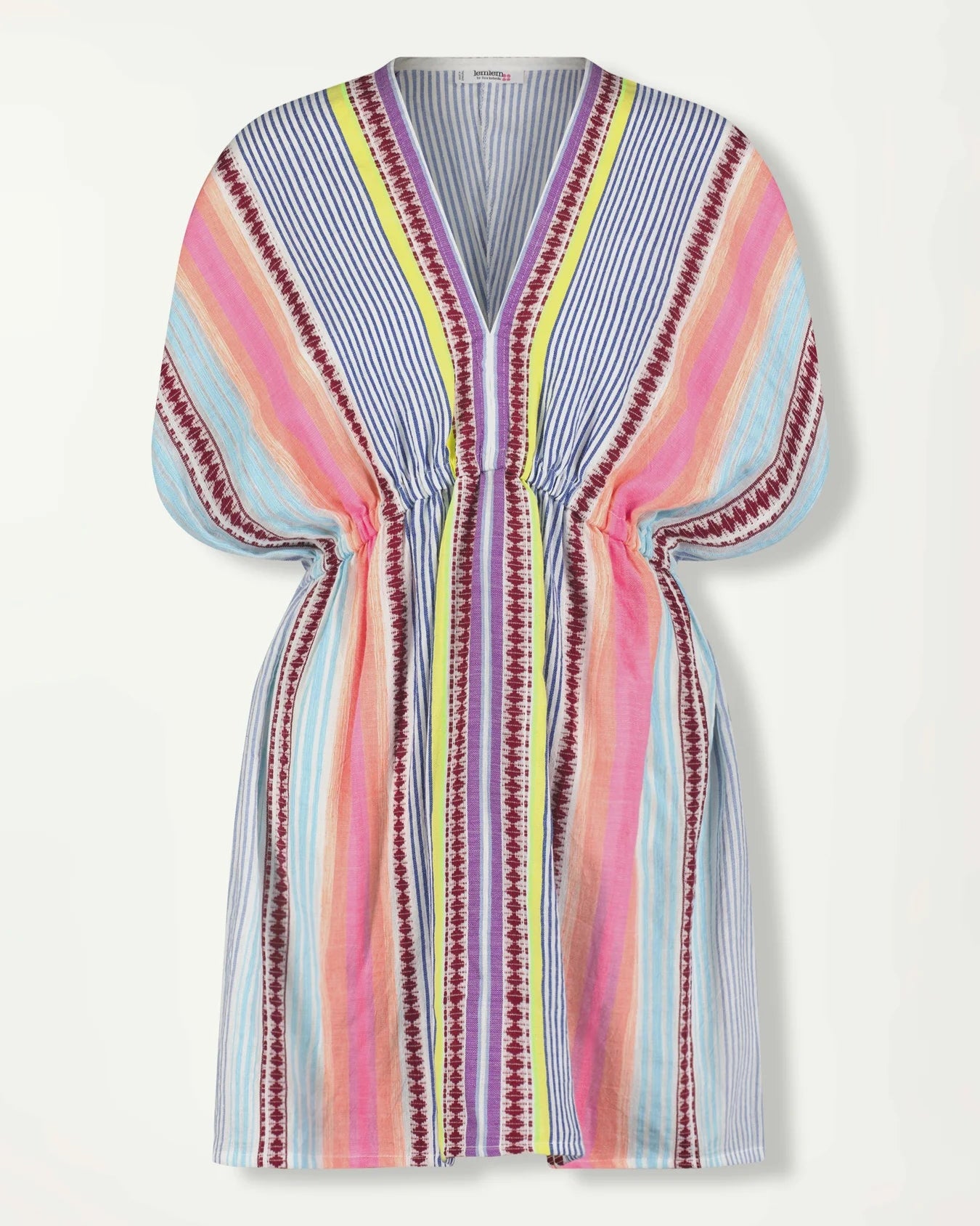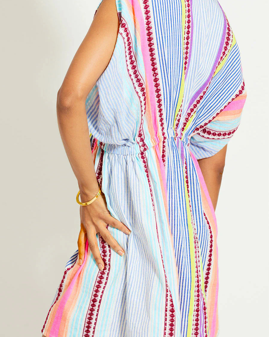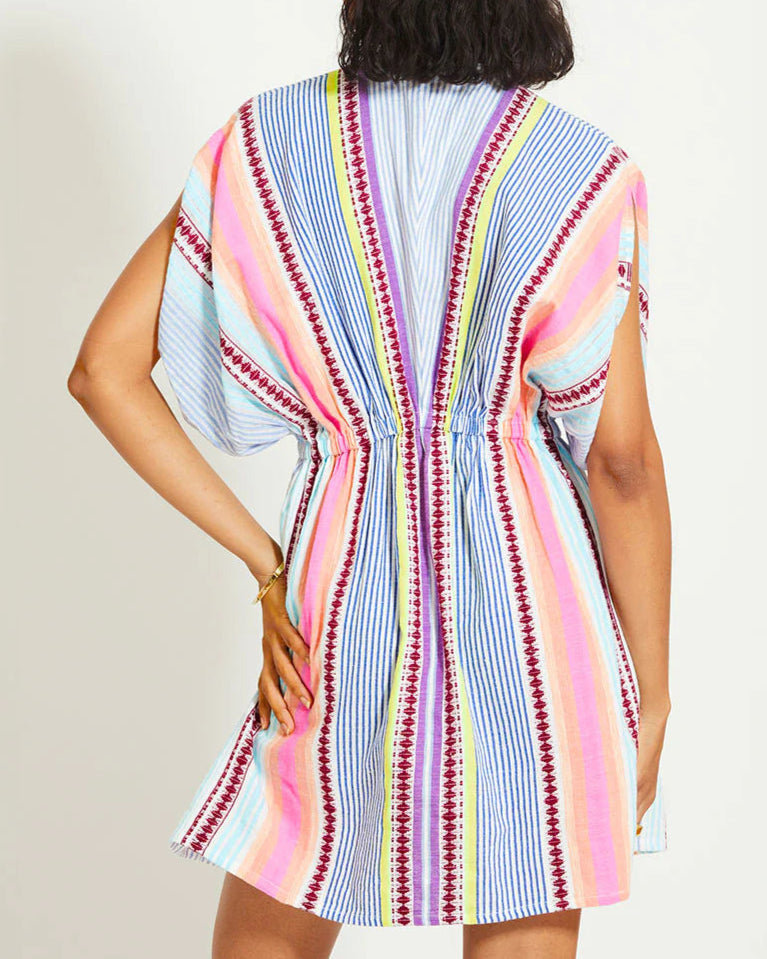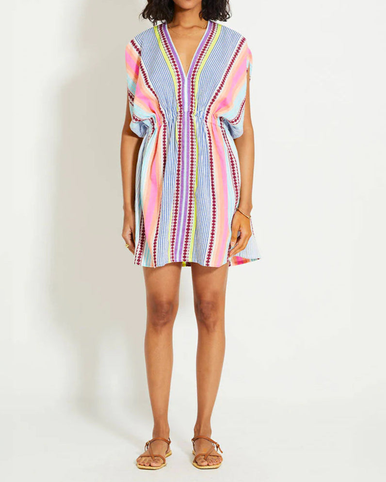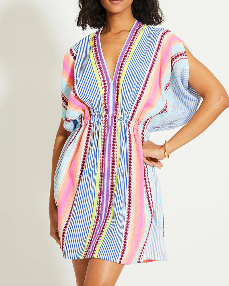 This versatile short dress features dolman sleeves, a deep plunge neckline and comfortable elastic waist to create an hourglass silhouette. The ruffled hem makes this style a resort wear staple.