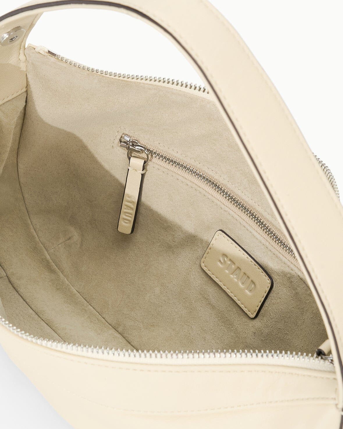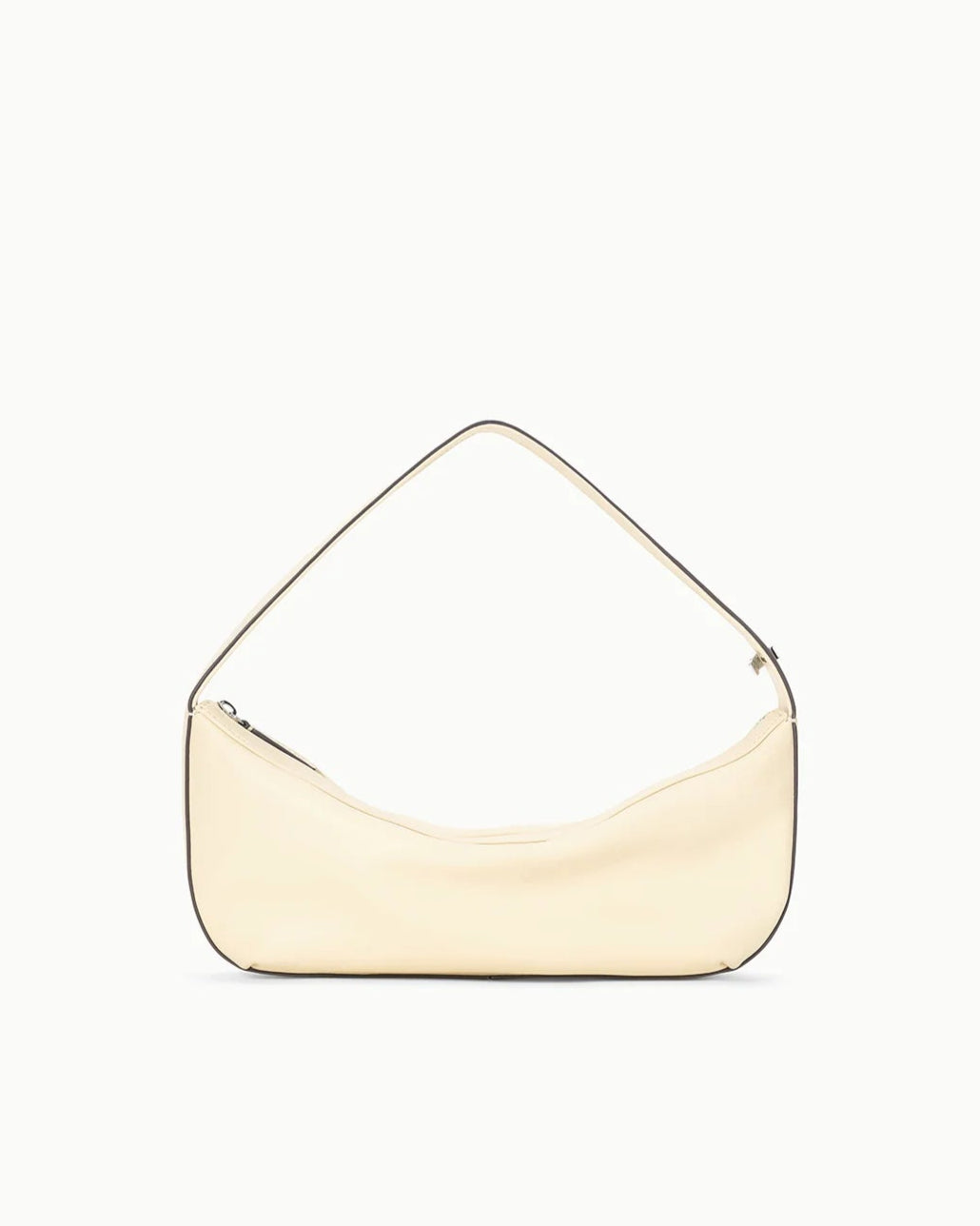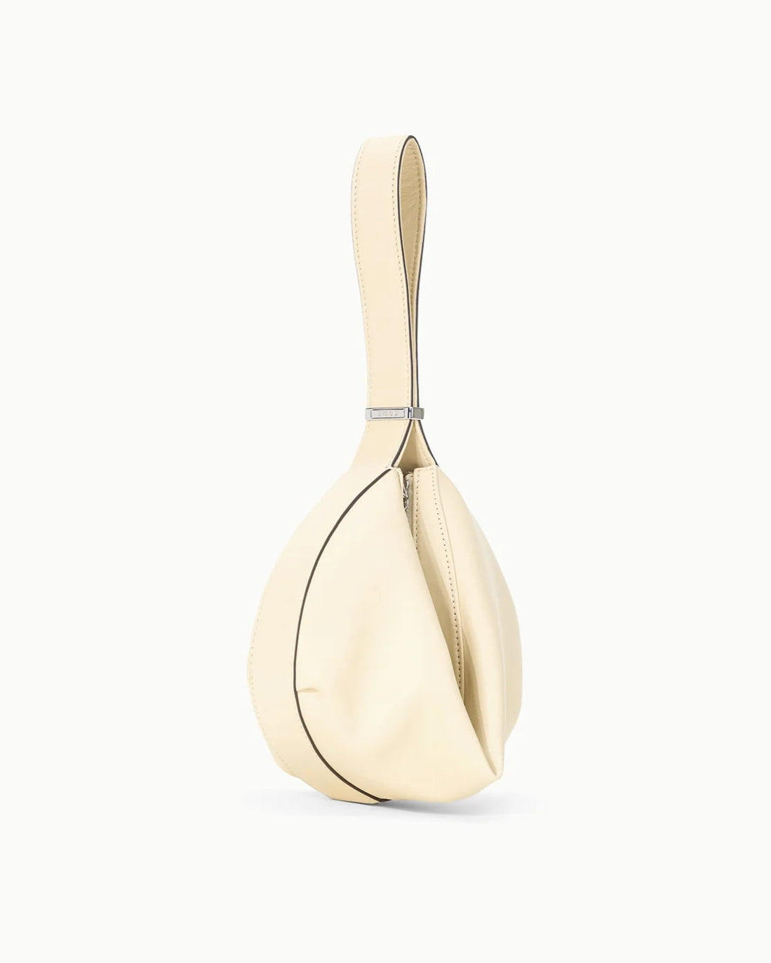 The Demy Shoulder Bag is a chic convertible bag that can be worn over the shoulder or hand held. It features signature hardware clasp on the strap to convert the shape to a handheld pouch. This style features a suede leather body, a top zipper, and signature hardware.