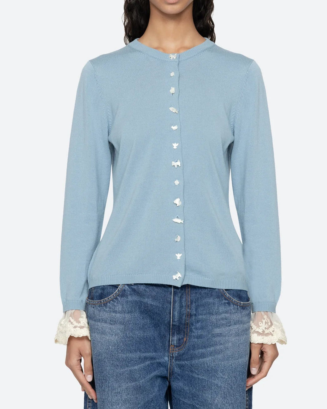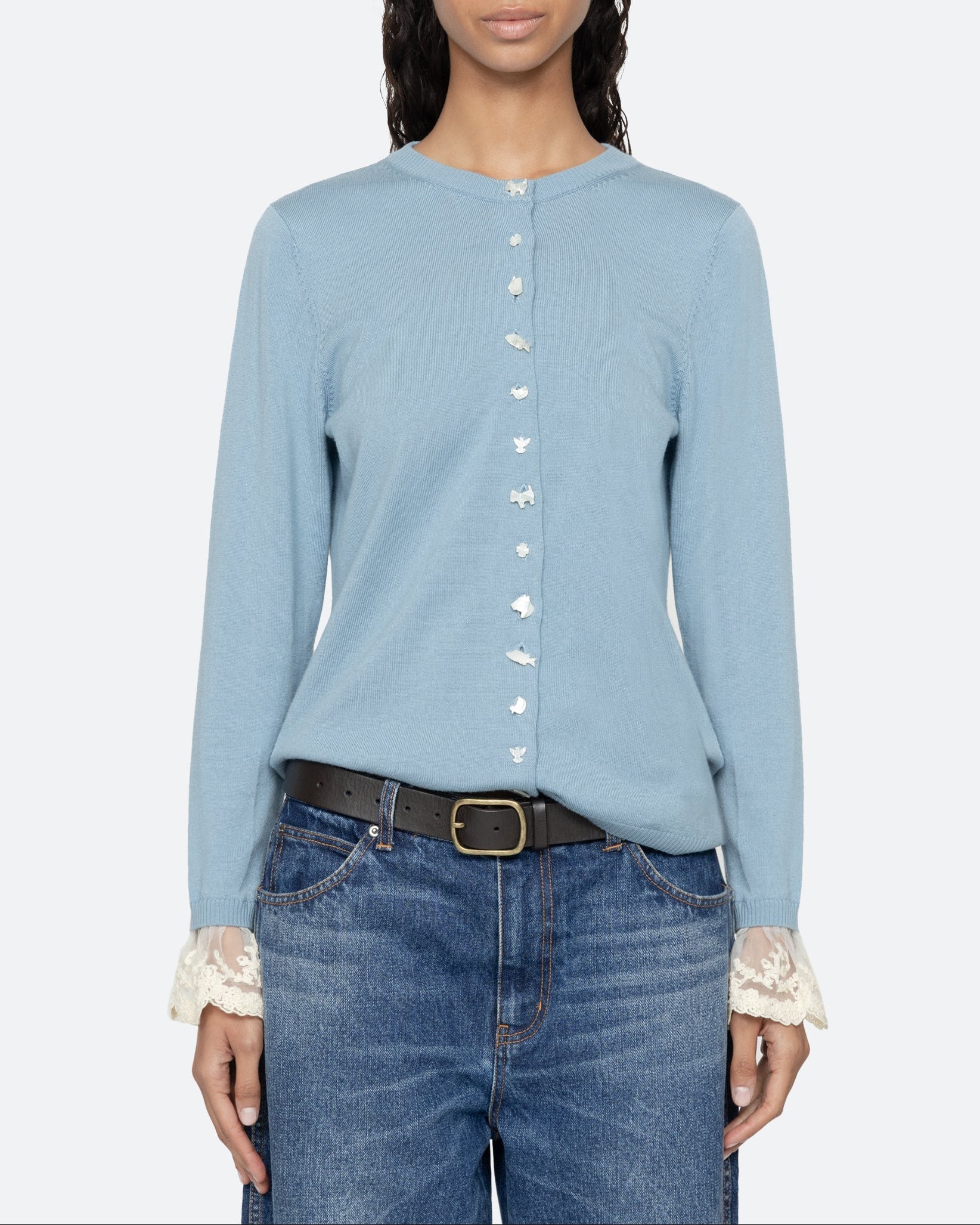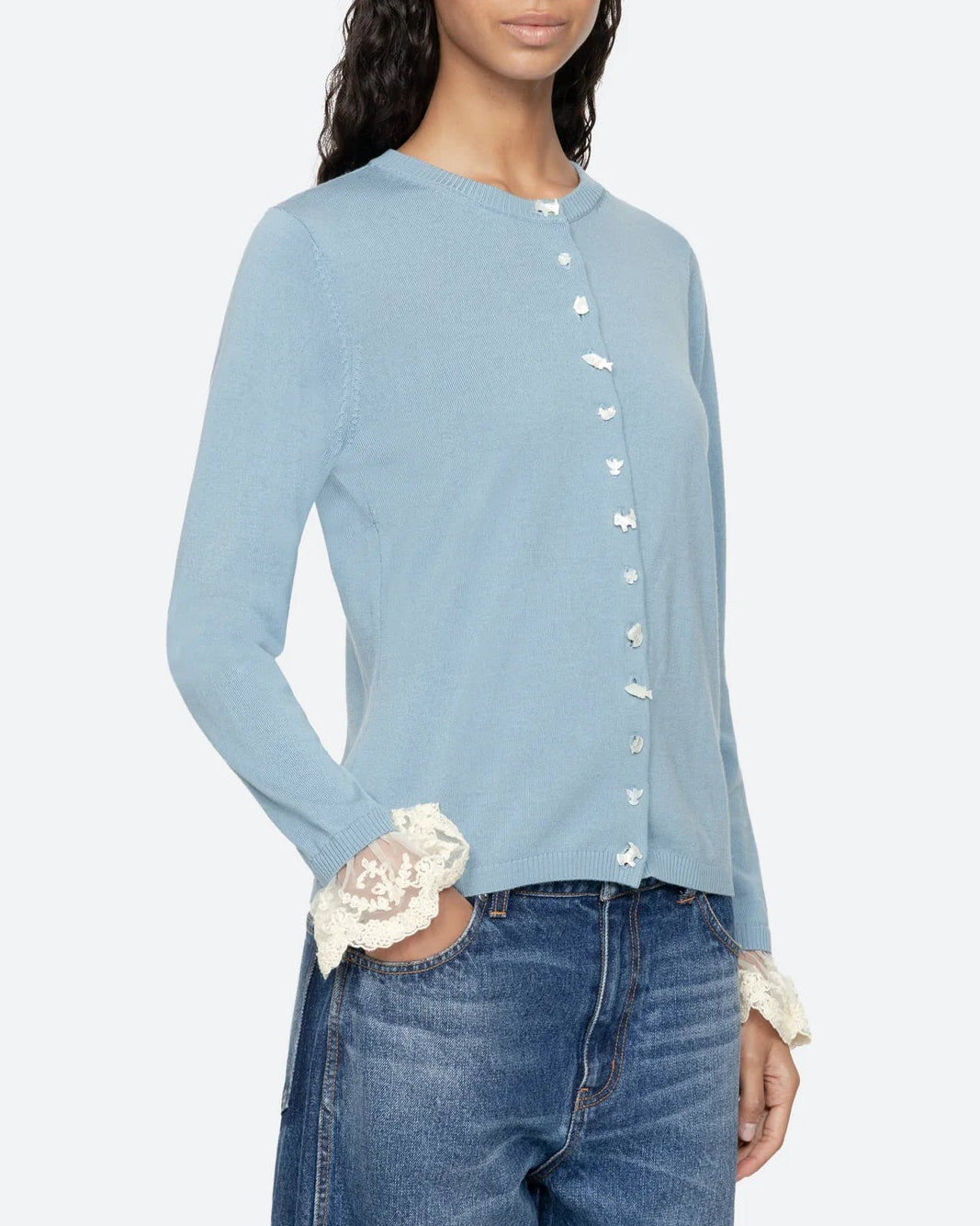 The Diane knit cardigan features intricate folkloric-inspired buttons and detachable lace cuffs, combining artisanal charm with versatile elegance.
