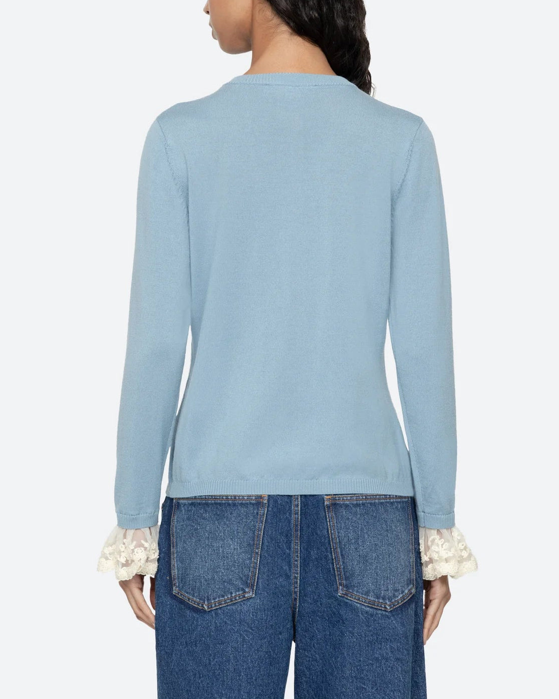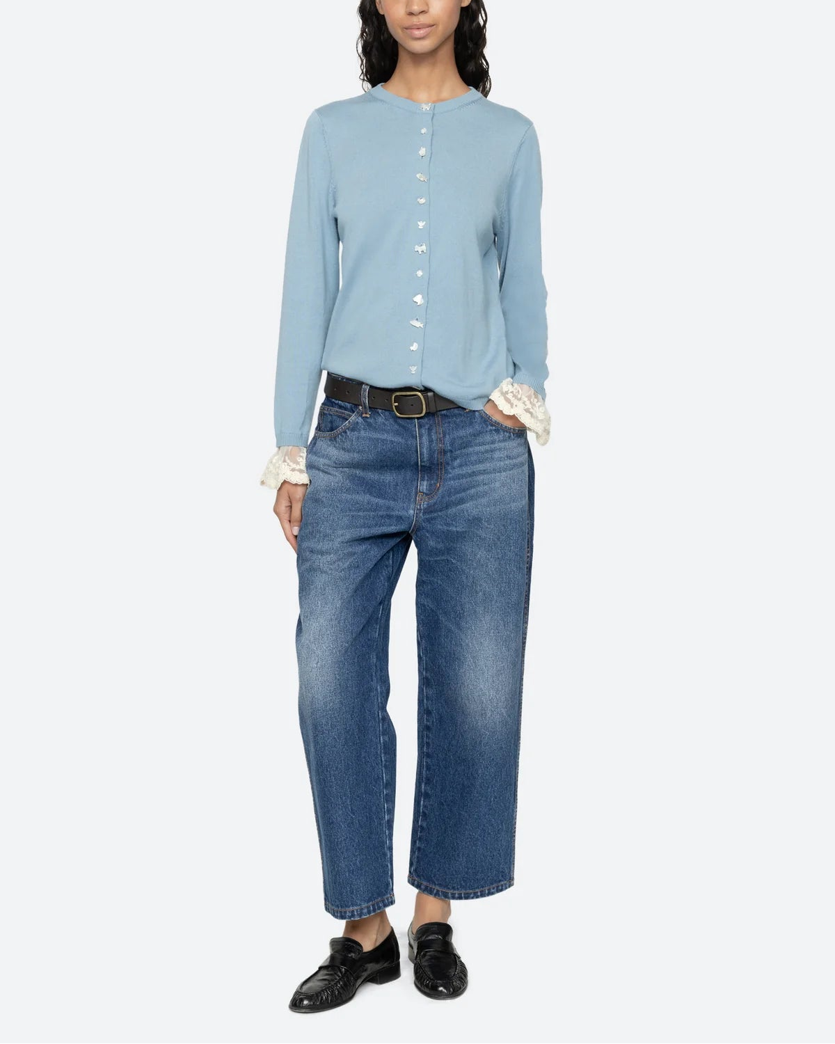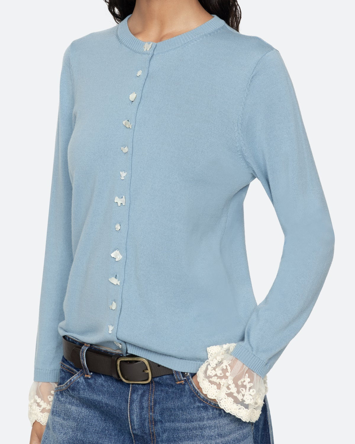 The Diane knit cardigan features intricate folkloric-inspired buttons and detachable lace cuffs, combining artisanal charm with versatile elegance.
