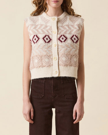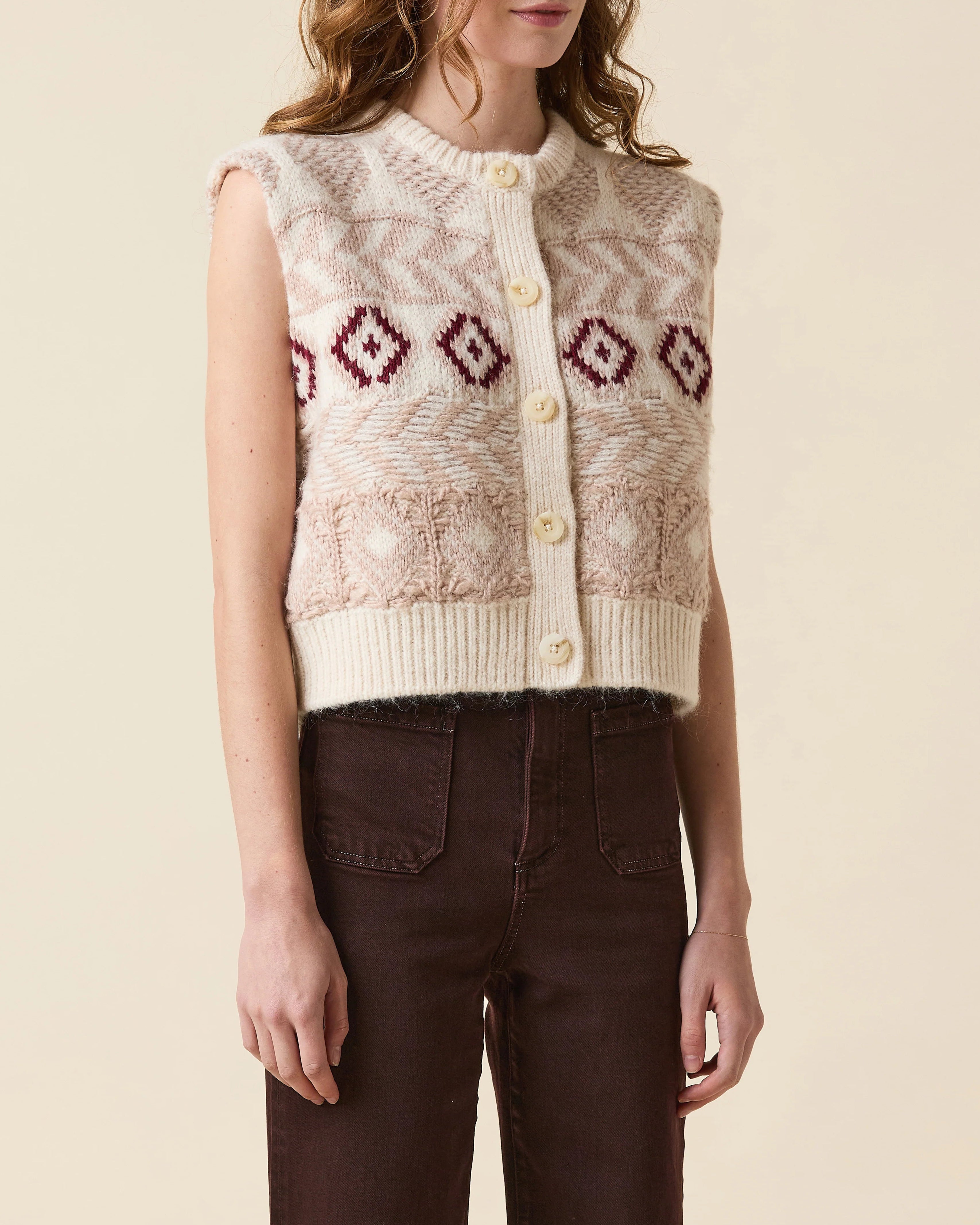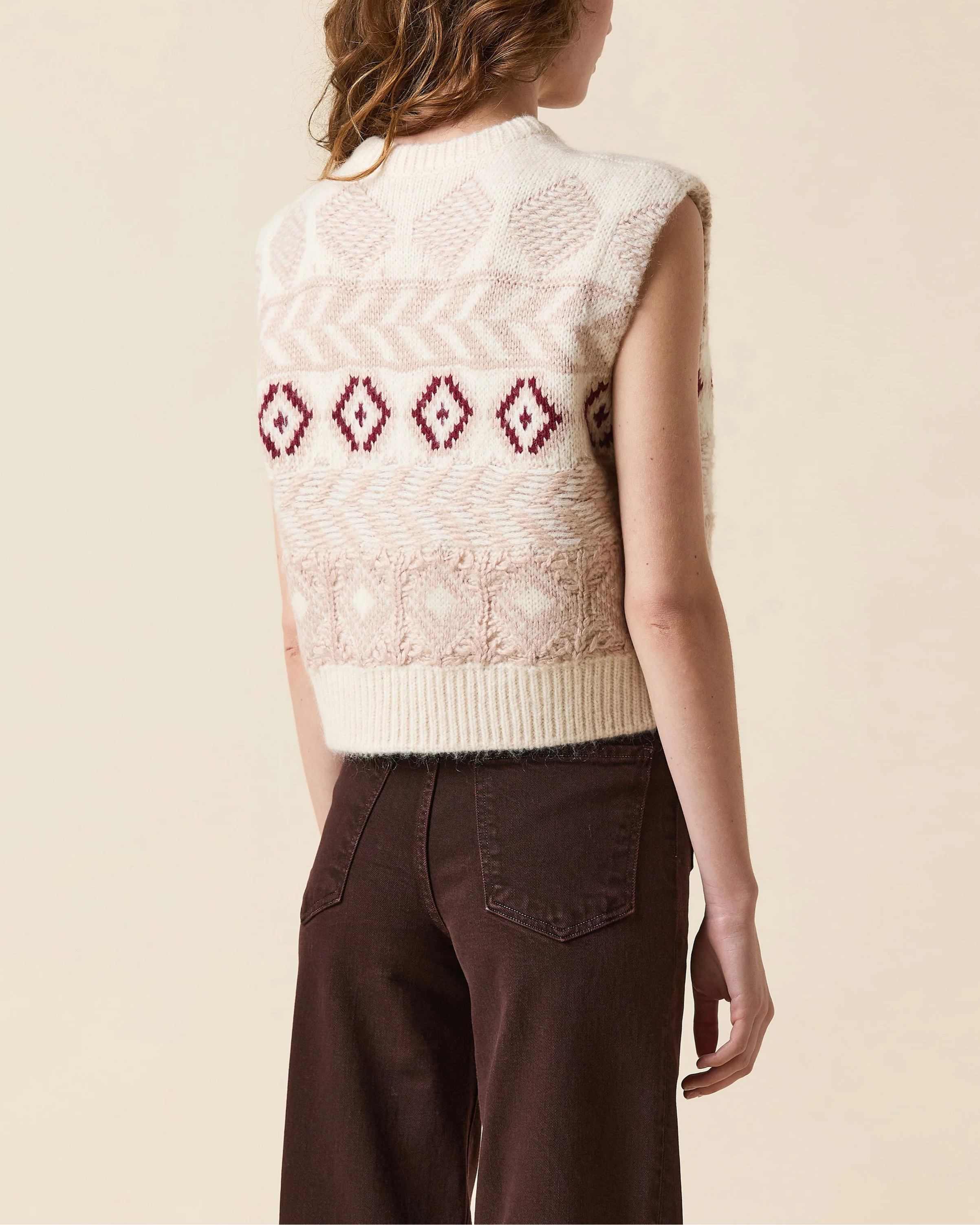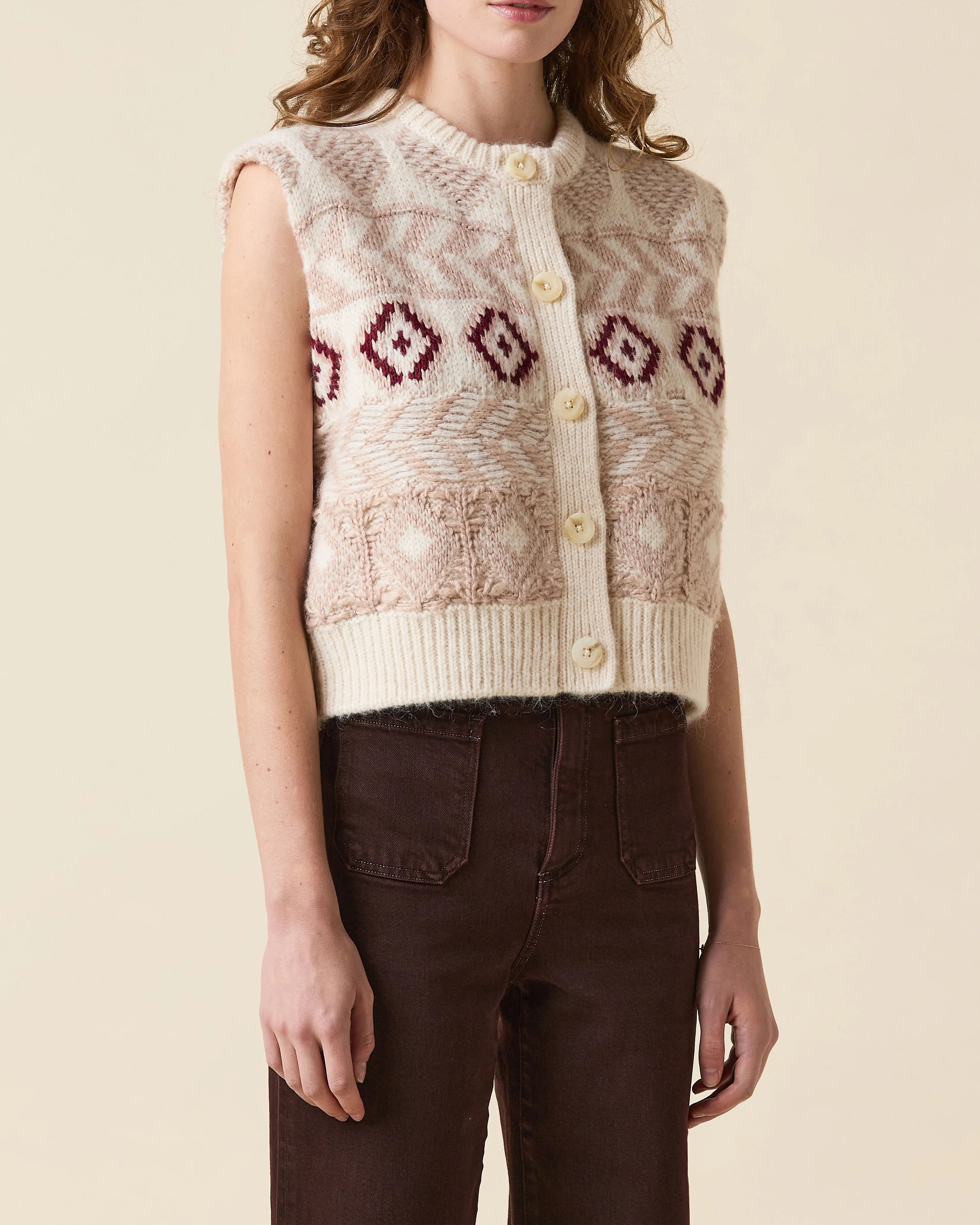 The Fair Isle vest is knitted to perfection with supersoft wool amd mohair blended yarns. The beautiful neautral colors make it endlessly versatile.
