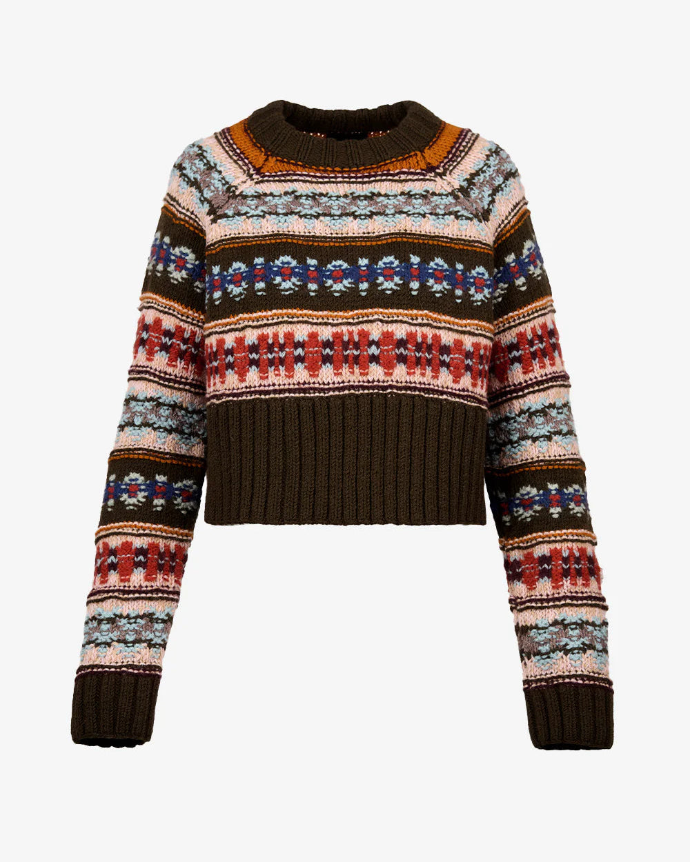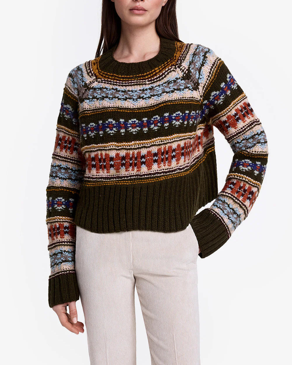 Details: Moderately fitted and cropped to the waist, this nostalgic knit features a classic fair isle pattern in a rich fall coloration. This garment fits true to size, take your usual size.