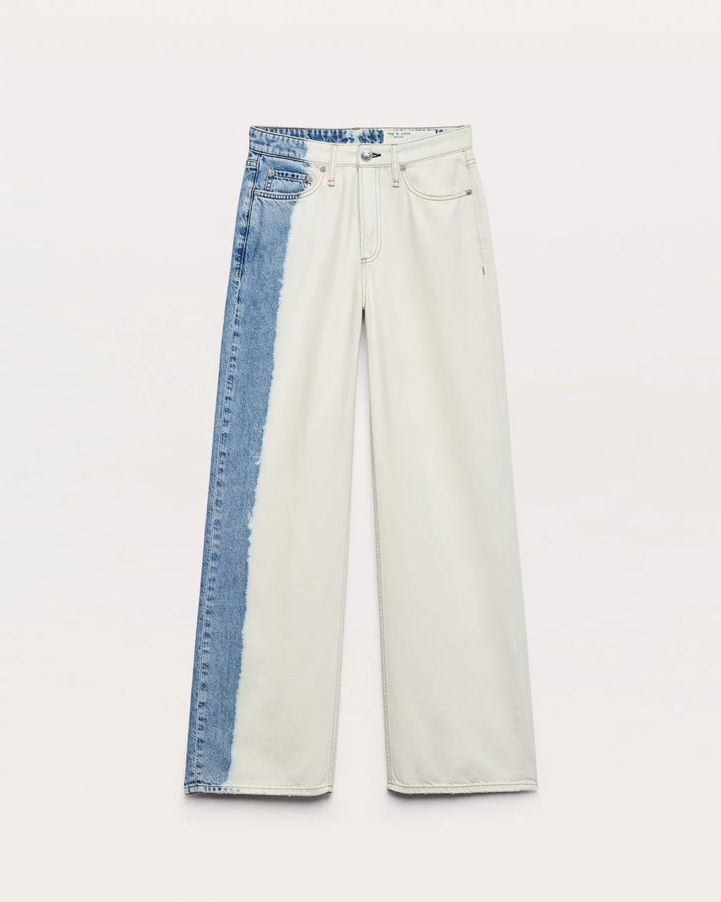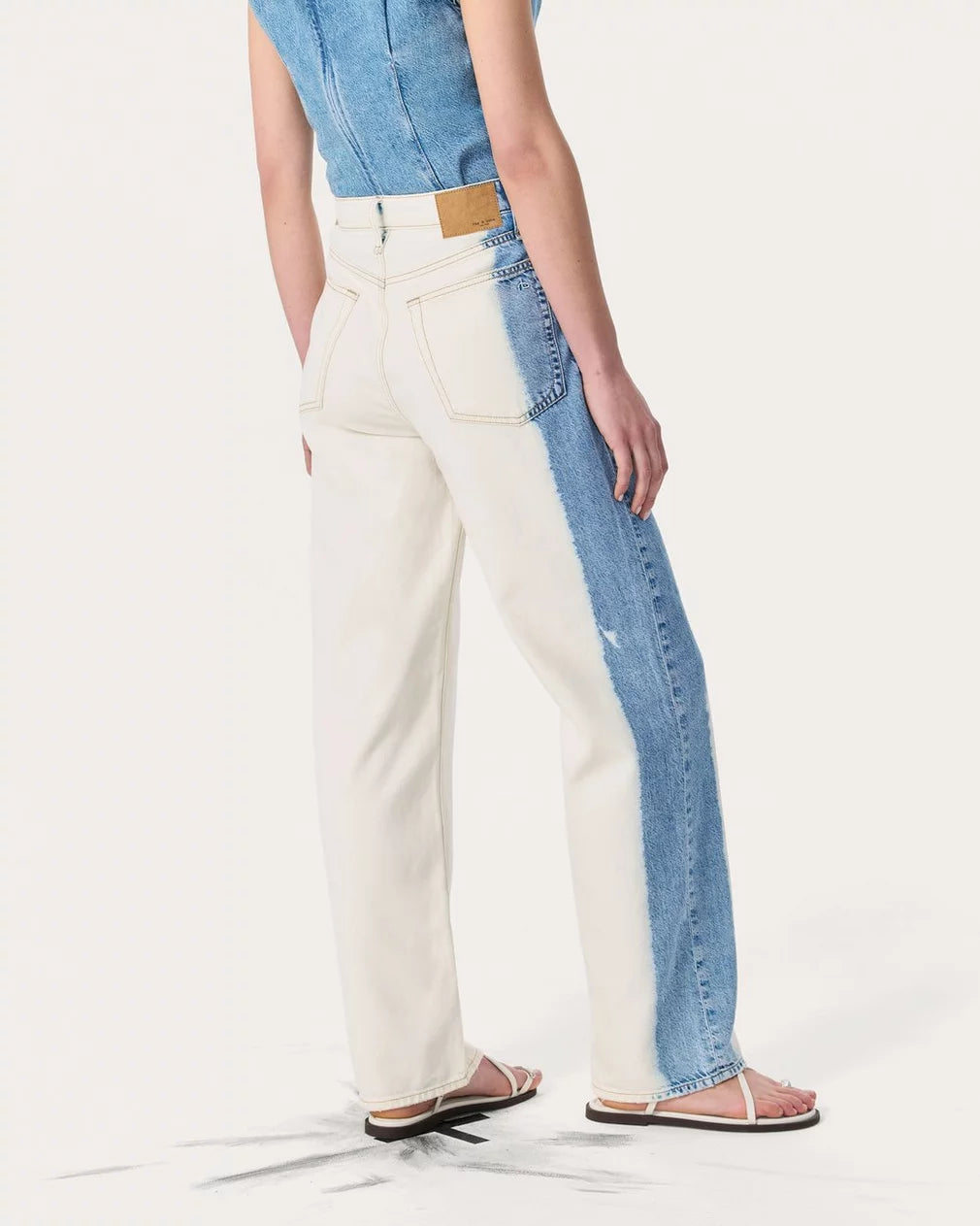 • In Bleach Stripe, a light indigo wash that's bleached all over except for a wide stripe with fluid, watercolor-like edges down the right leg