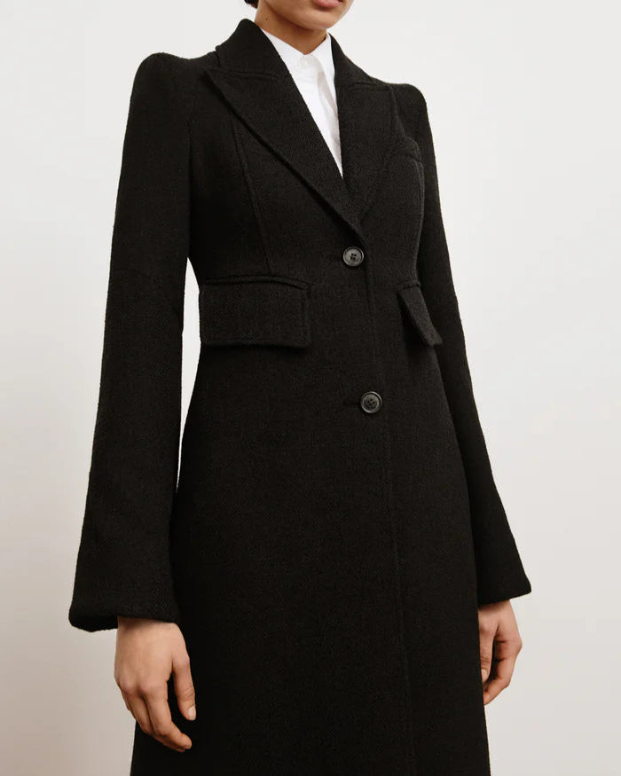 Details: Decidedly tailored, this proven coat silhouette has been modified with an architectural bell sleeve in a stretch boucle. Fits true to size.
